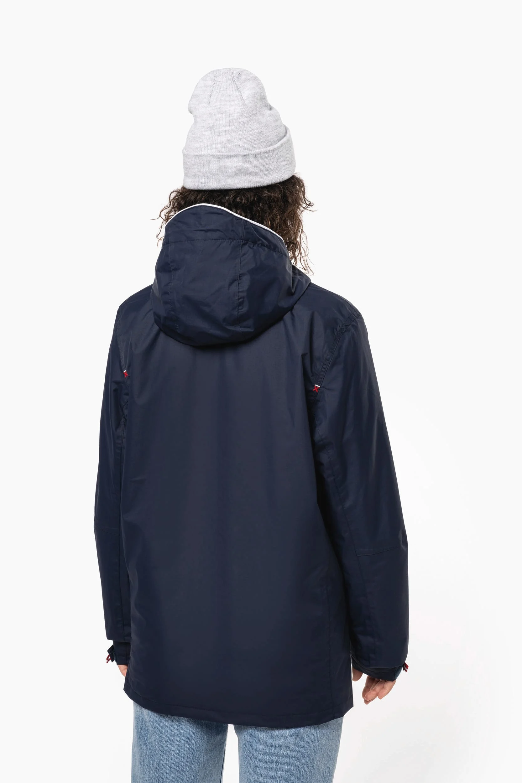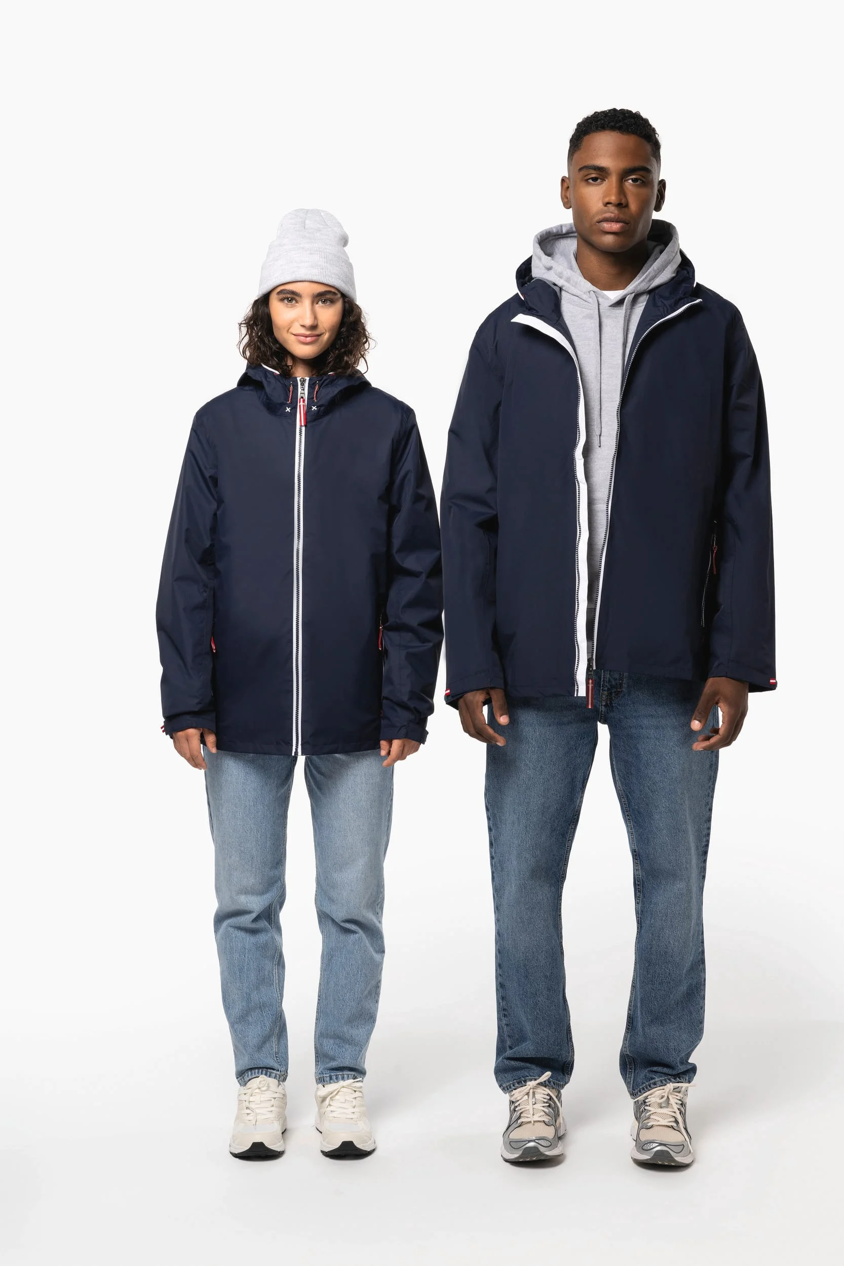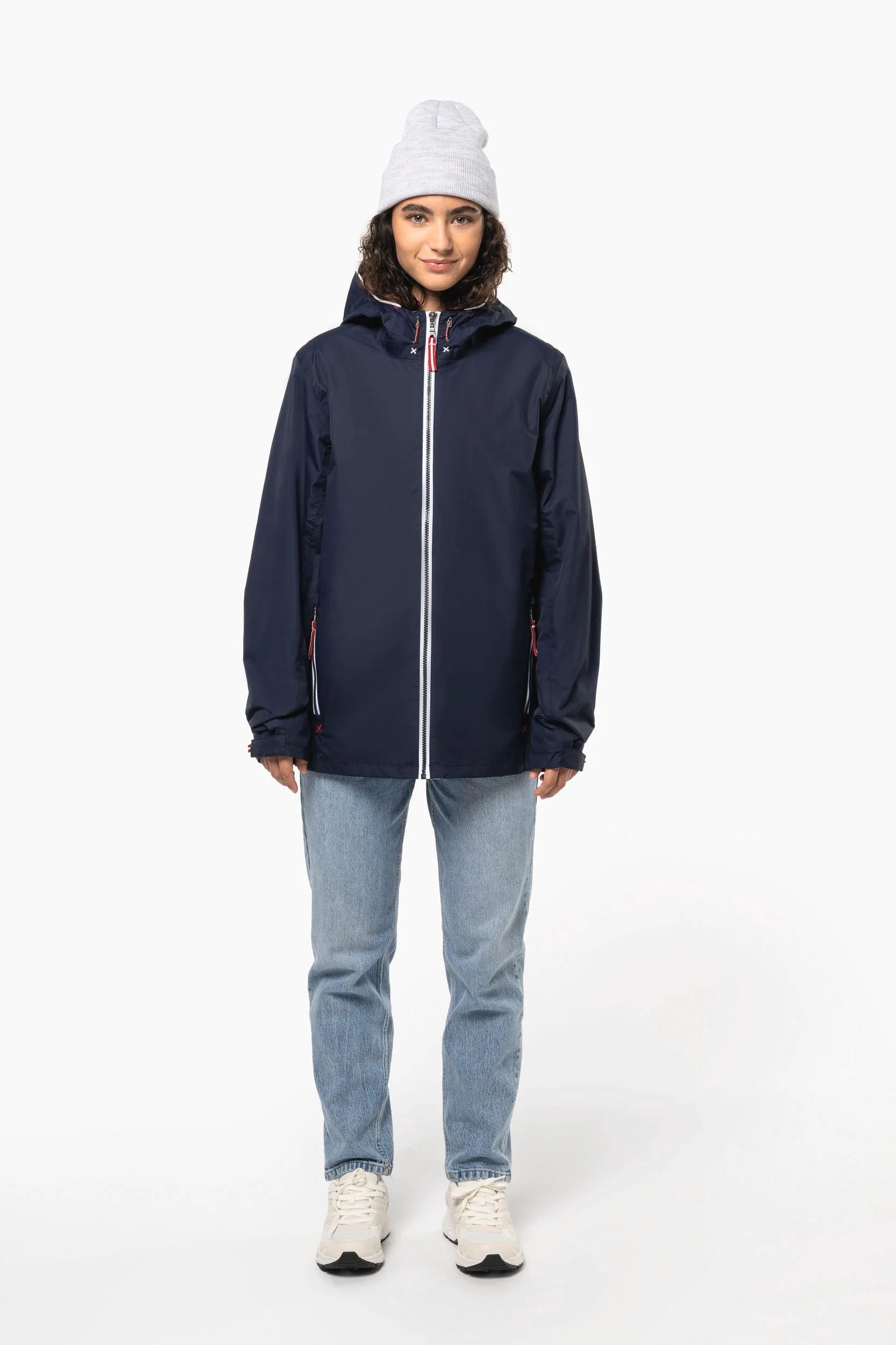 100% polyamide. Respirante 5000 g/m²/24h. Imperméable 3000 mm. Coutures thermosoudées étanches. Fermeture zippée. 2 poches zippées devant. 1 poche intérieure. Doublure polyester contrastée. Capuche doublée filet et réglable. Zip de personnalisation bas et poitrine.