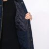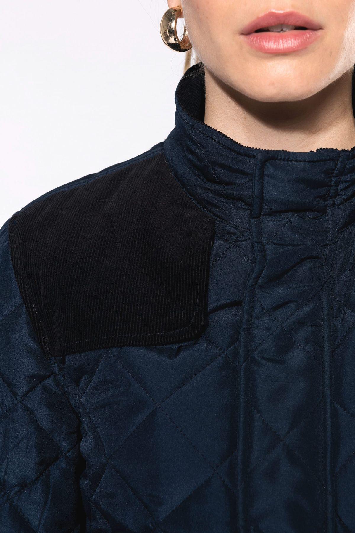 Extérieur : 100% polyester pongé. Intérieur : 100% polyester taffetas. Fermeture zippée cachée par patte pressionnée. 2 double poches devant avec rabat pressionné. 1 poche intérieure. Empiècement pressionné sur l’épaule. Finitions bas de manches et de vêtement, coudières, intérieur col et dessous du rabat de poche en velours côtelé. 2 fentes d’aisance pressionnées au bas du dos. Boutons pression au poignet.