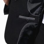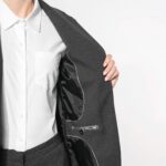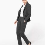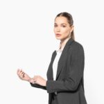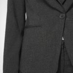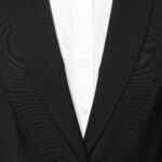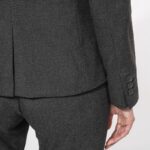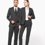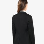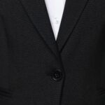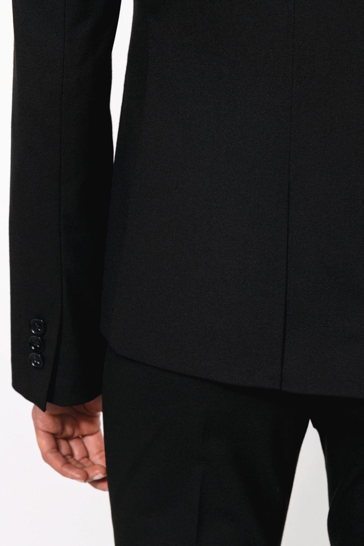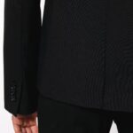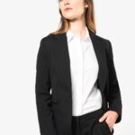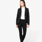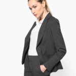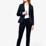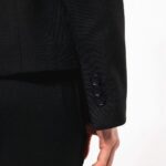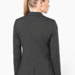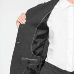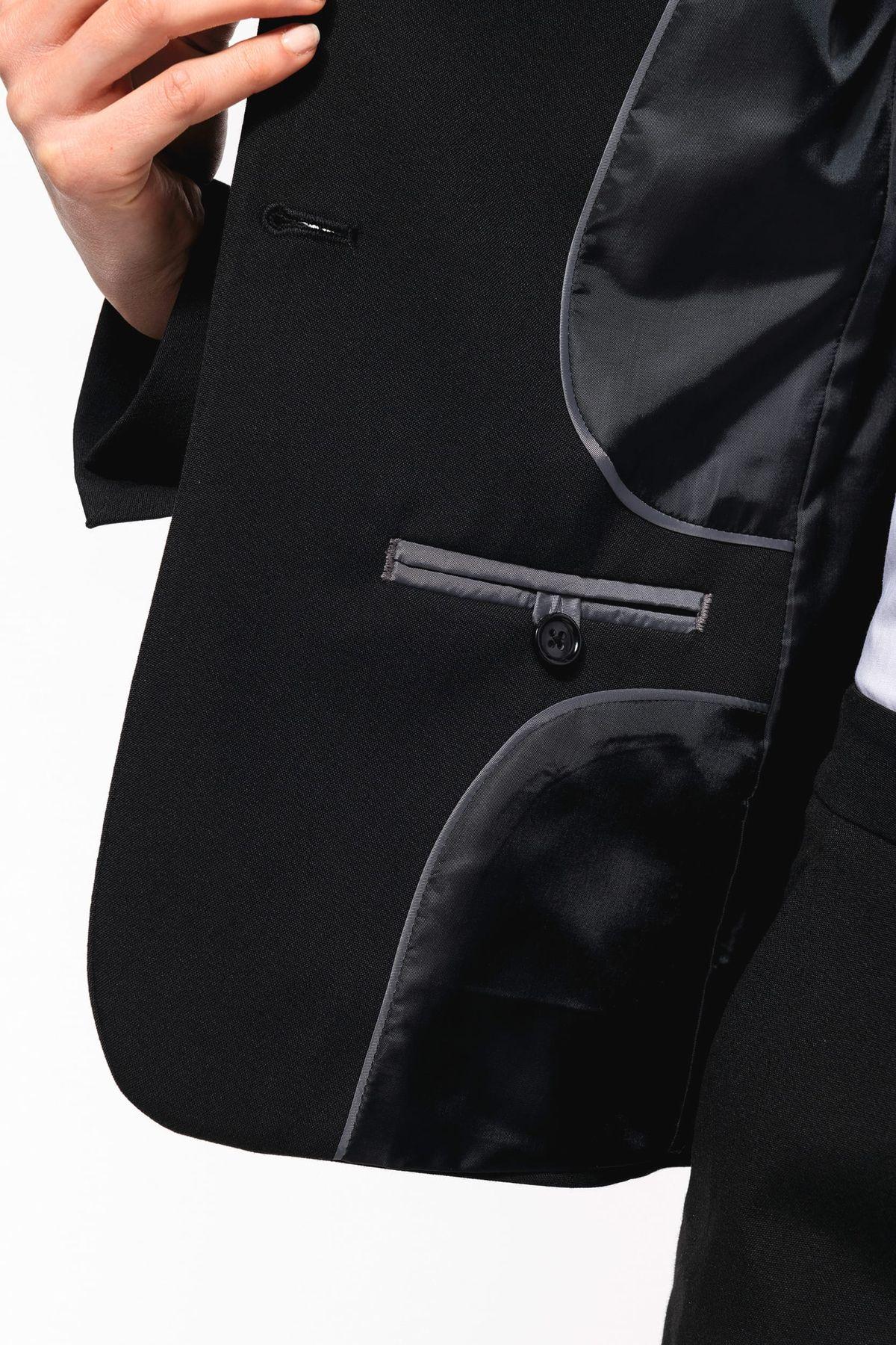64% polyester / 34% viscose / 2% élasthanne. Doublure 100% polyester taffetas. Veste 1 bouton. 2 poches passepoilées devant. 2 poches intérieures boutonnées. Bas de manches avec 3 boutons. 1 fente d’aisance au dos.
