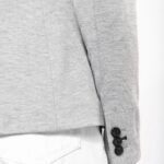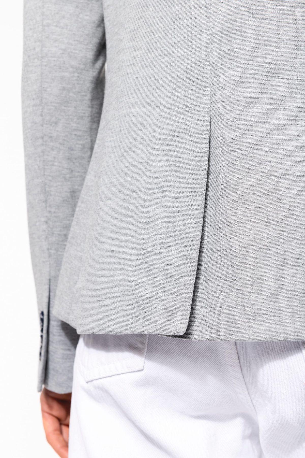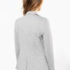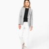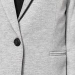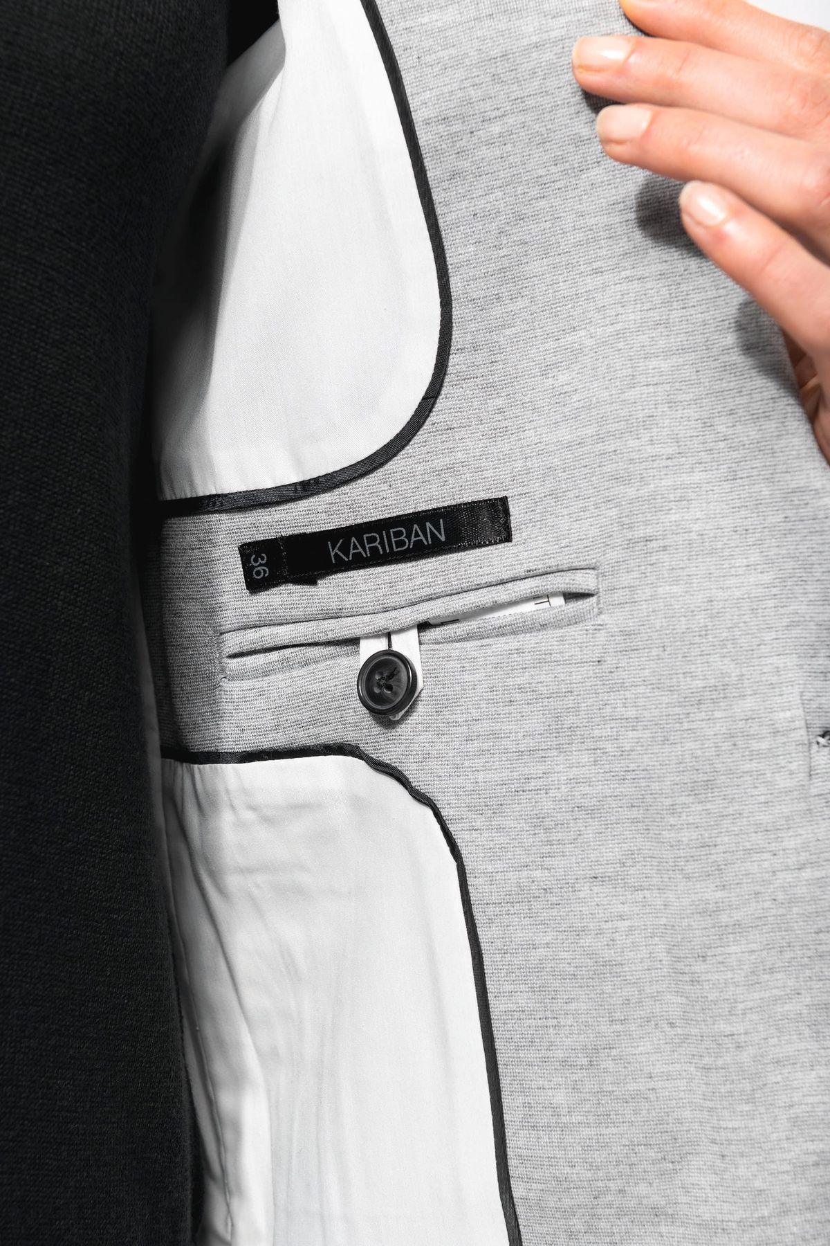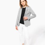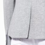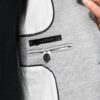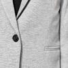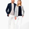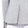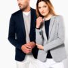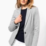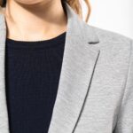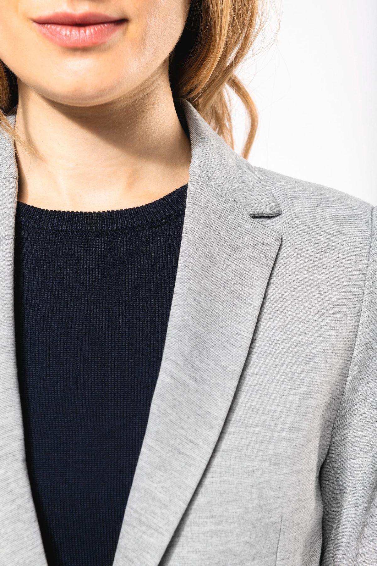 80% polyester / 18% coton / 2% élasthanne (Night navy heather) – 74% polyester / 24% viscose / 2% élasthane (Light grey heather). Maille interlock. Doublure corps en polycoton et manches en taffetas polyester. Veste 1 bouton. 2 poches passepoilées devant. 1 poche intérieure boutonnée. Liseré contrasté intérieur devant. Bas de manches avec 3 boutons dont 1 avec une boutonnière contrastée. 1 fente d’aisance au dos. 1 zip invisible intérieur côté coeur pour accès personnalisation.