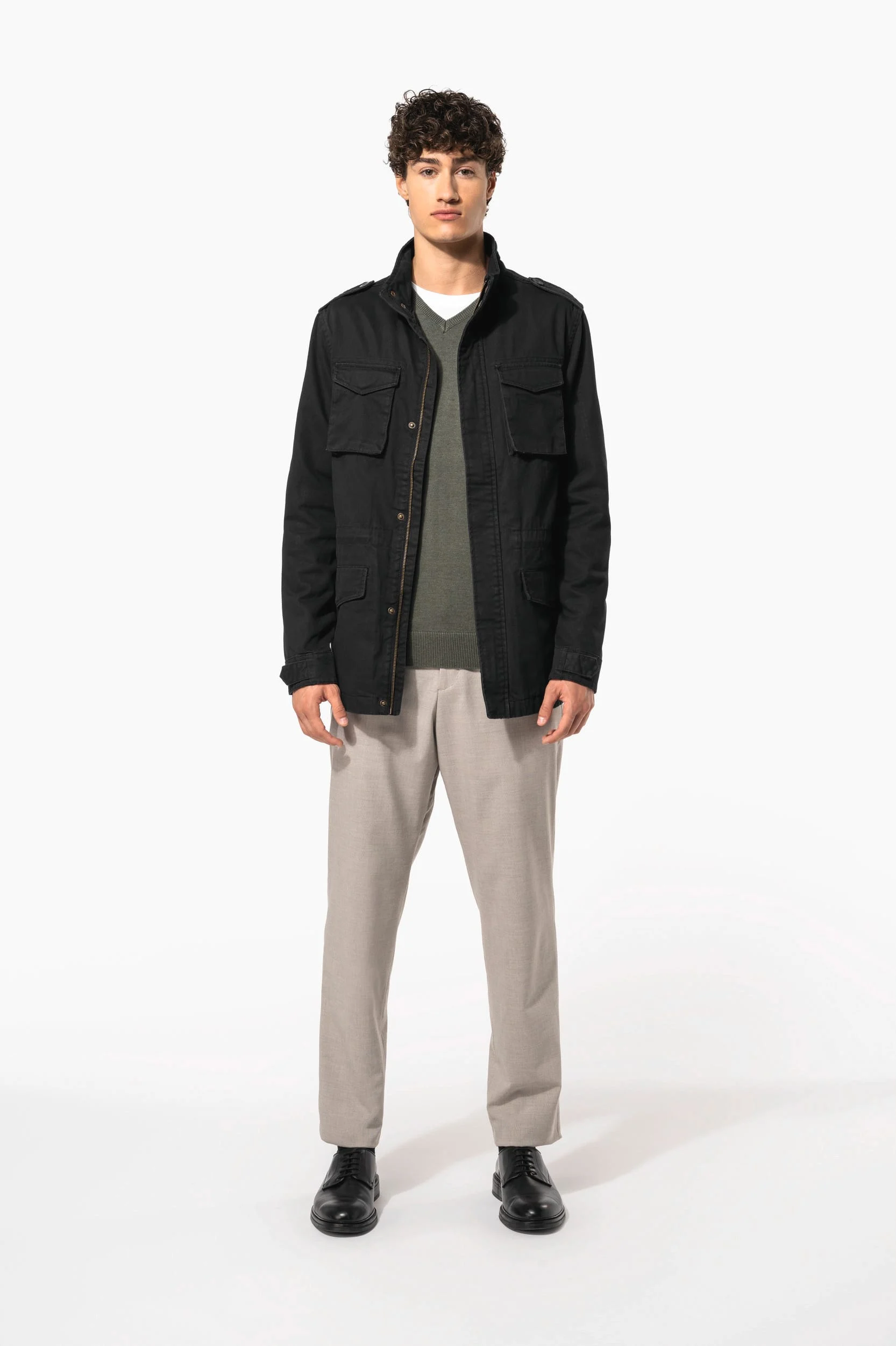 100% coton. Construction twill. Coupe standard. Vêtement lavé. Cette technique peut présenter des variations de couleurs d’un produit à un autre et rend chaque pièce unique. Fermeture zippée avec curseur en métal et tirette en tissu principal ainsi qu’une patte de boutonnage avec boutons pression invisibles milieu devant. Finition intérieure avec parmenture. Quatre poches extérieures avec bouton pression. Poignet avec patte décorative maintenu avec un bouton pression. Cordon de serrage ajustable à la taille avec stopper effet cuir à l’intérieur du vêtement. Patte épaule avec bouton. Poche intérieure avec velcro. Demi lune intérieure pour faciliter la personnalisation avec bride de suspension intérieure.
