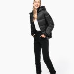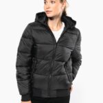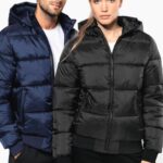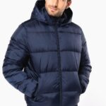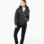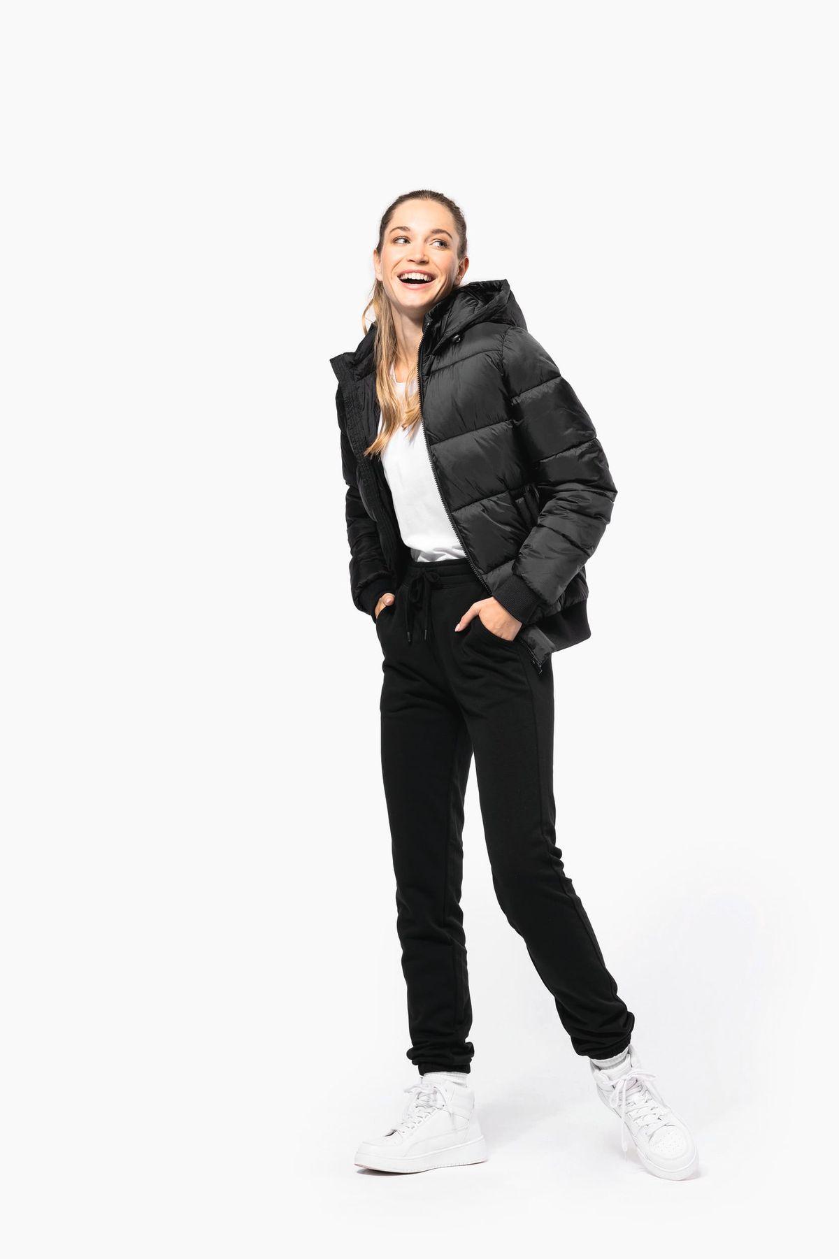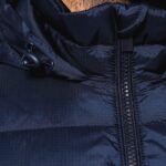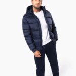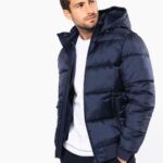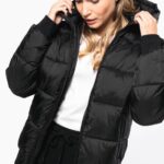 100% polyamide recyclé ripstop 380T. Tissu déperlant. Garniture intérieure 100% polyester recyclé. Doublure 100% polyamide recyclé. Coupe straight. 2 poches côtés zippées et passepoilées. 1 poche plaquée intérieure avec bande auto-agrippante. Fermeture zippée devant. Col montant avec capuche 3 parties doublée, matelassée et ajustable à l’aide d’un stoppeur. Bord-côtes au bas de manches et de vêtement. Zip invisible intérieur côté cœur et au bas du vêtement pour accès personnalisation. Garnissage injecté : le grammage peut varier selon les zones du vêtement. Le poids total est indicatif.