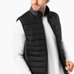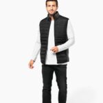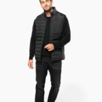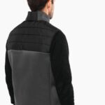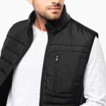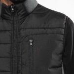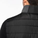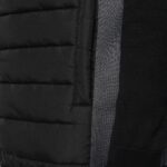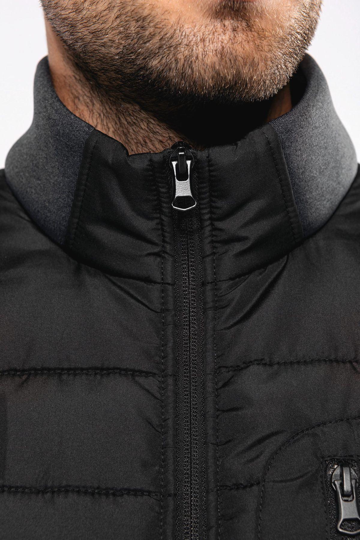 Tissu côtés, dos et partie du col : 94% polyester / 6% élasthanne. Tissu devant et dos : 100% polyester pongé 300T avec enduction polyuréthane. Rembourrage 100% polyester 120g. Doublure 100% polyester recyclé taffetas 230T. Partie corps avant et tiers dos matelassée. Fermeture devant avec zip nylon inversé. 2 poches côtés et passepoilées devant. Poche plaquée poitrine côté cœur fermée avec zip inversé. Col avec empiècements bi-matière. Biais de finition élastiqué aux emmanchures et bas de vêtement.