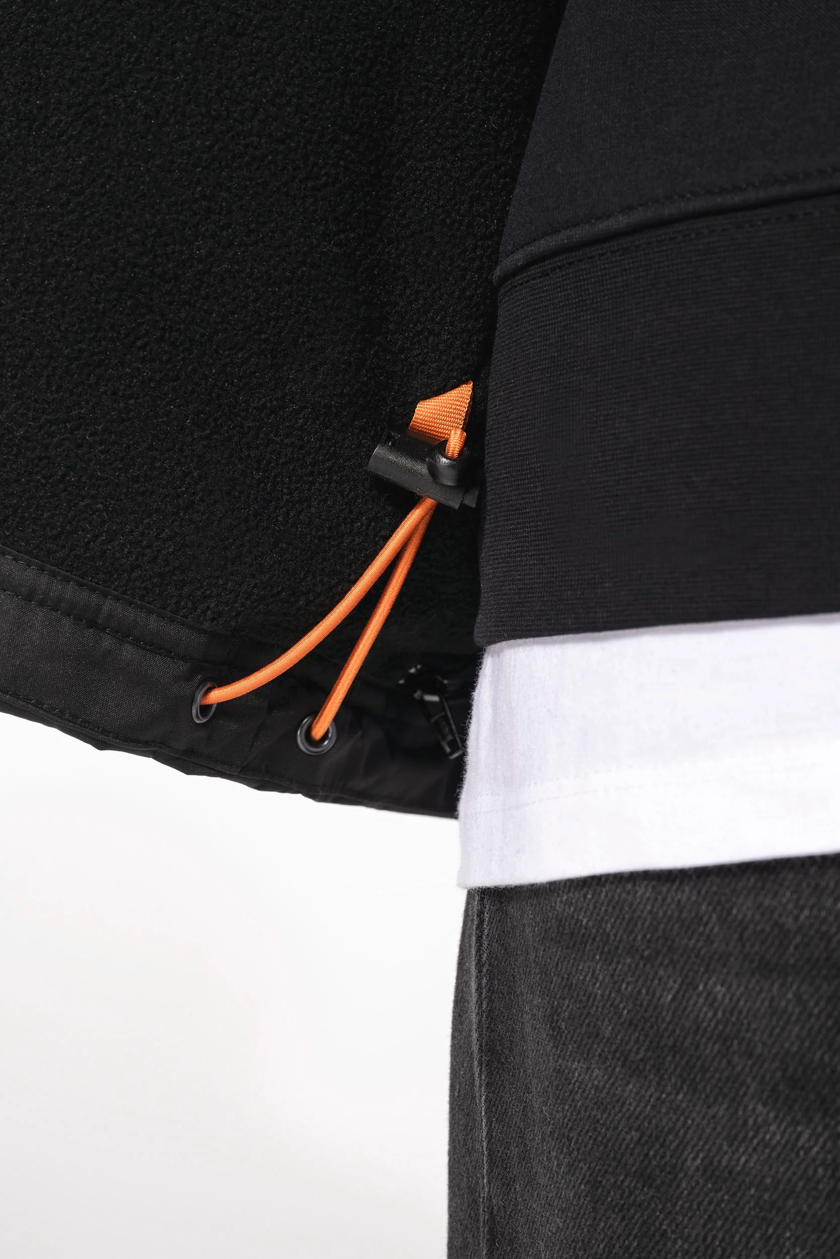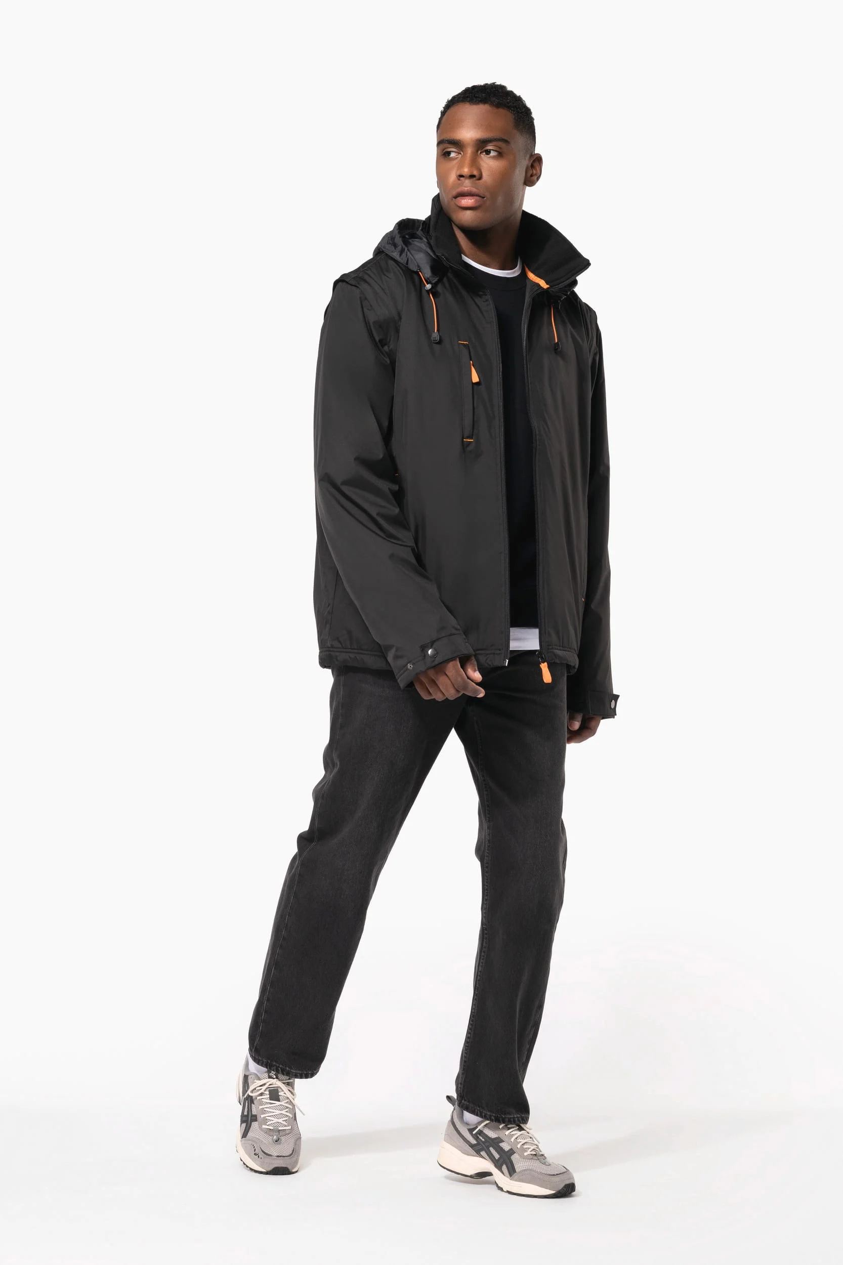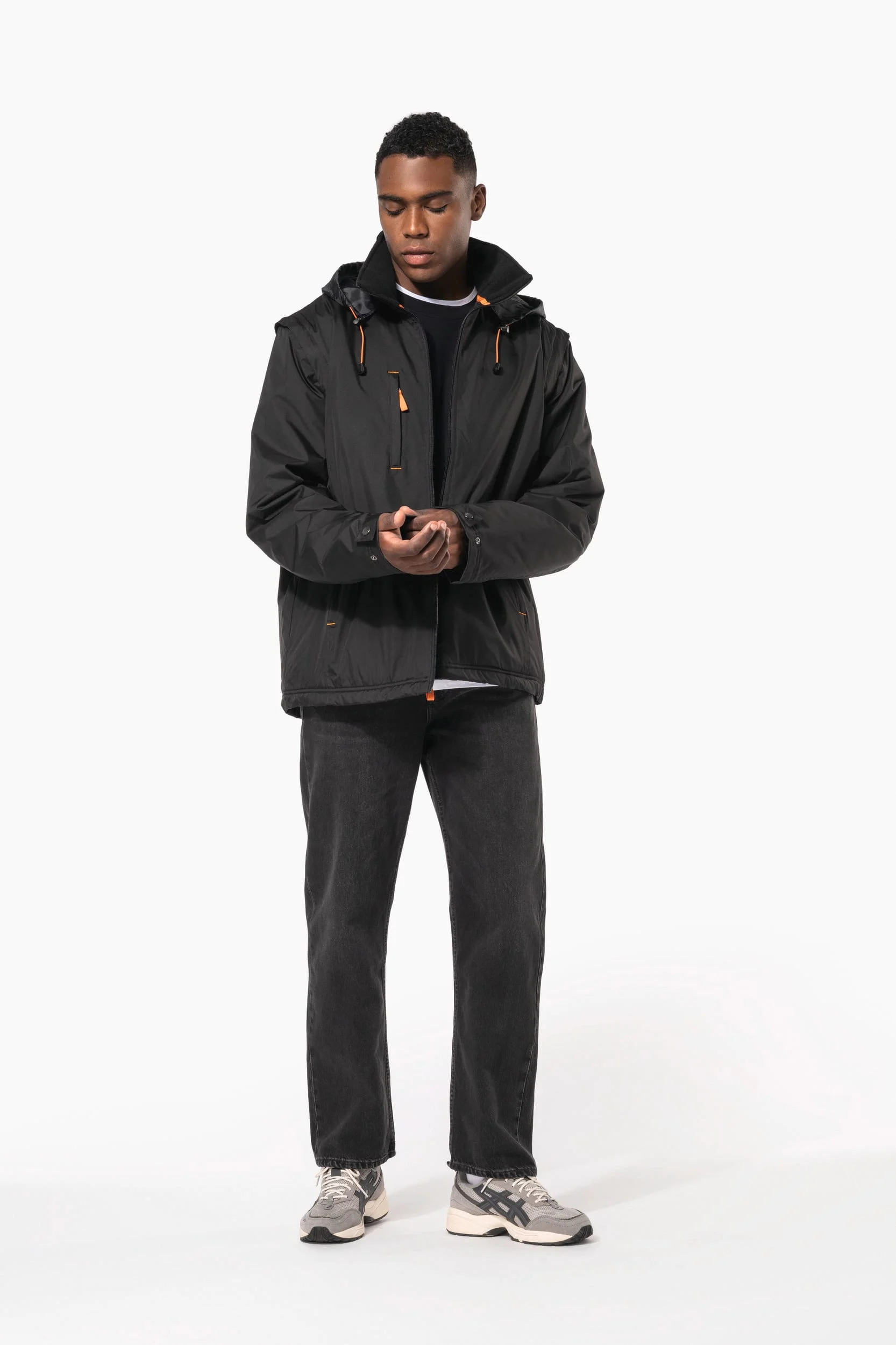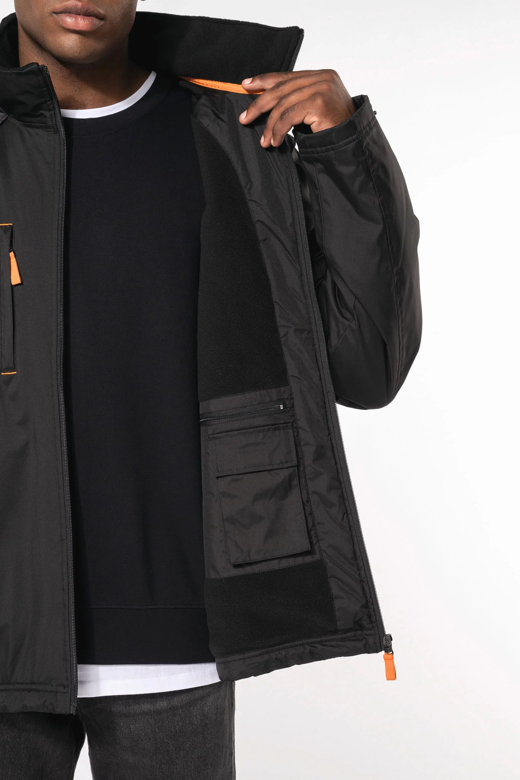 100% polyester avec enduction PVC. Doublure corps en polaire 100% polyester. Tissu souple. Fermeture zippée. 3 poches zippées. Manches amovibles zippées. Patte de serrage au bas des manches. Tirette du zip, tresse encolure et points d’arrêt contrastés. 3 poches intérieures (2 zippées et 1 poche pour le téléphone). Cordon de serrage intérieur contrasté au bas du vêtement. Capuche dans le col. Ouverture zip pour personnalisation.