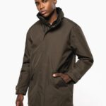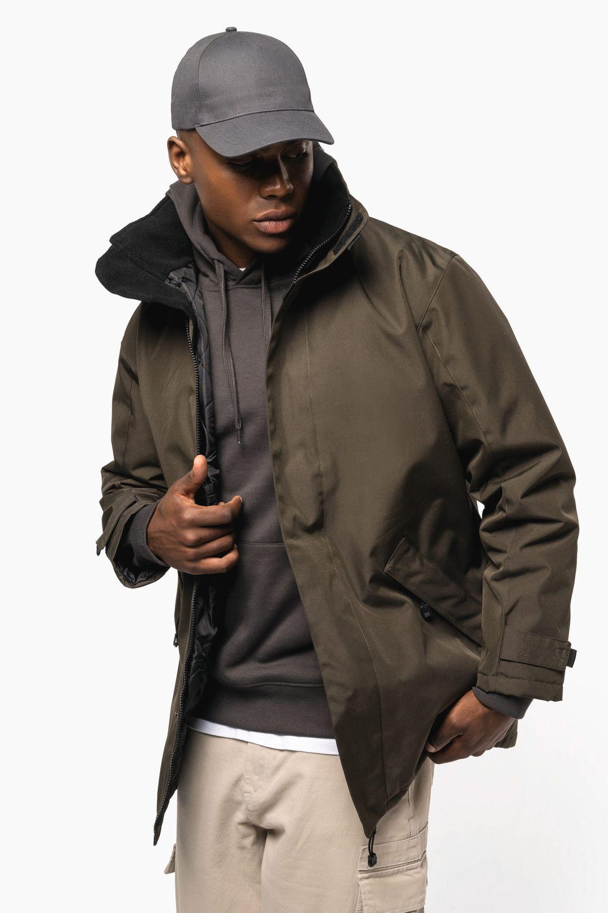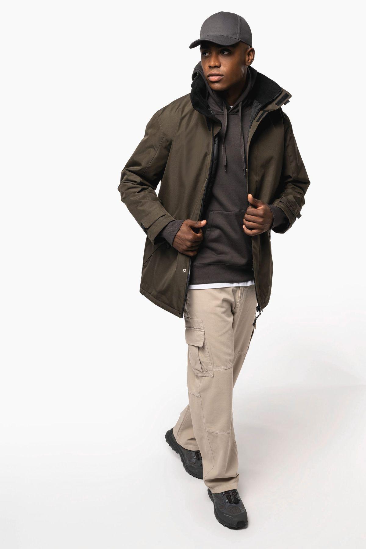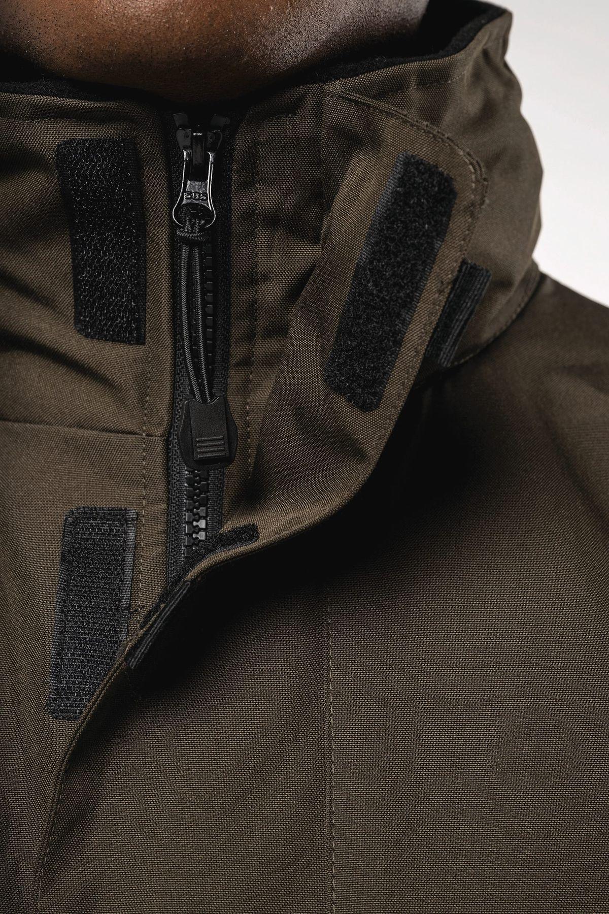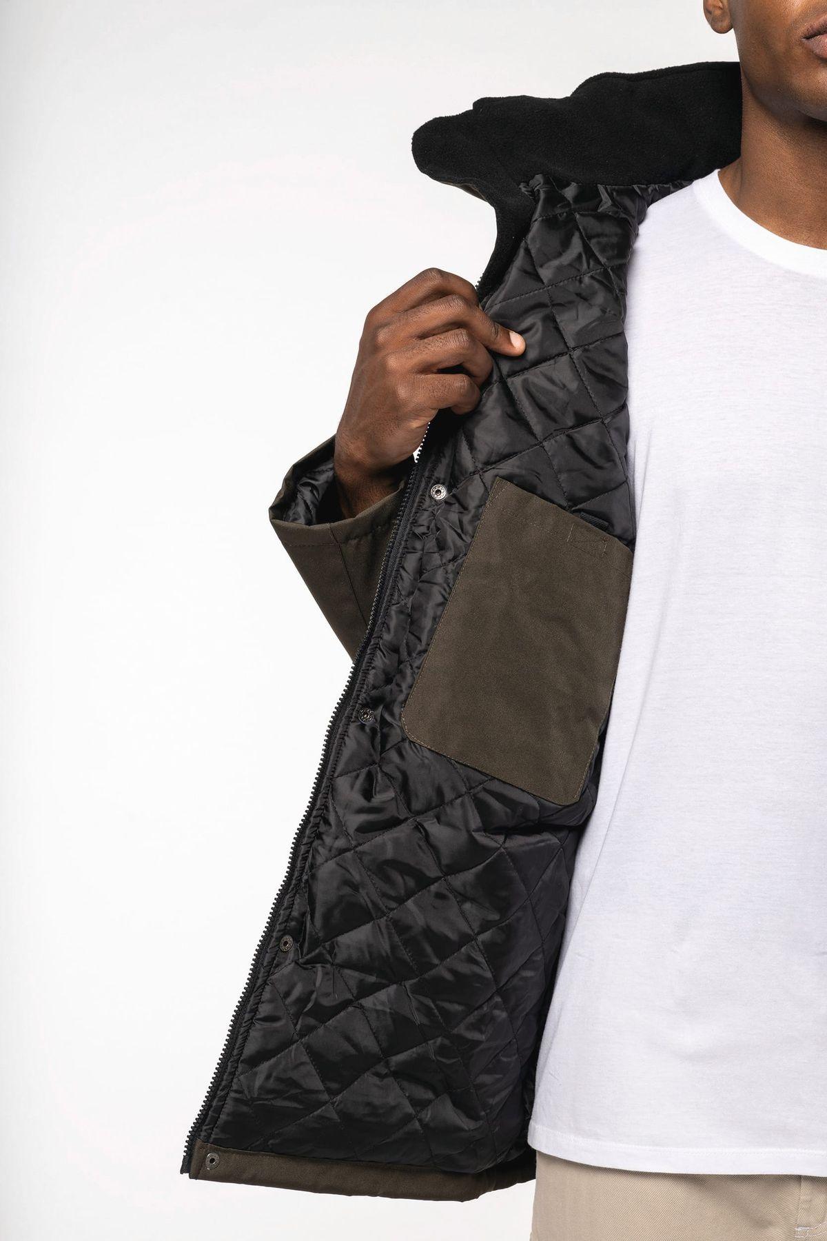 Extérieur : 100% polyester Oxford. Intérieur : polyester matelassé. Fermeture zippée avec patte auto-agrippante et pressions invisibles. 2 poches extérieures zippées. 2 poches intérieures dont 1 poche pour téléphone portable. Capuche dans le col. Col doublé polaire. Zip pour personnalisation.