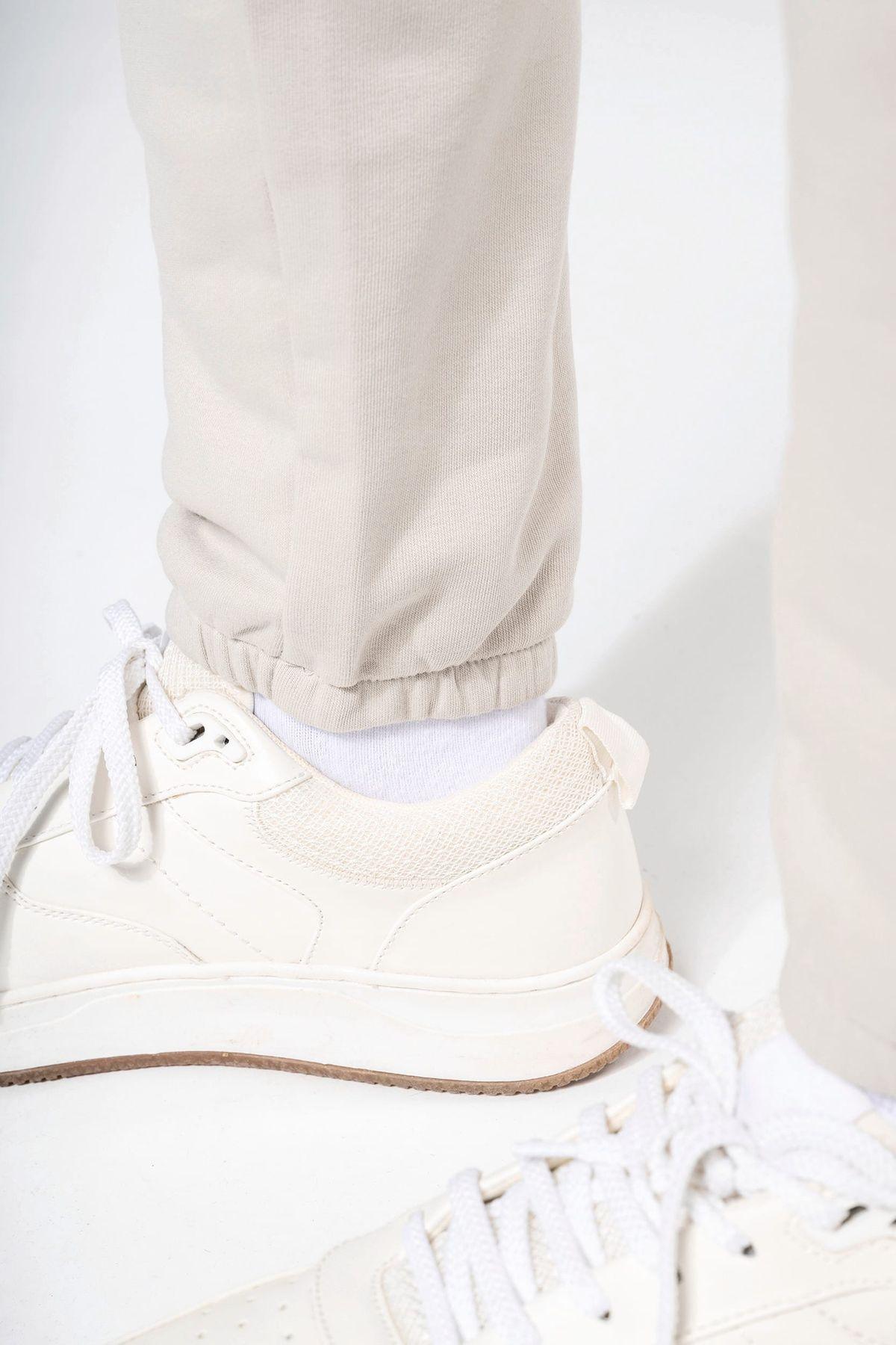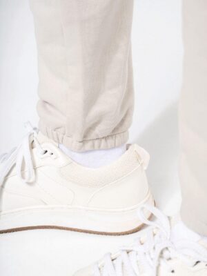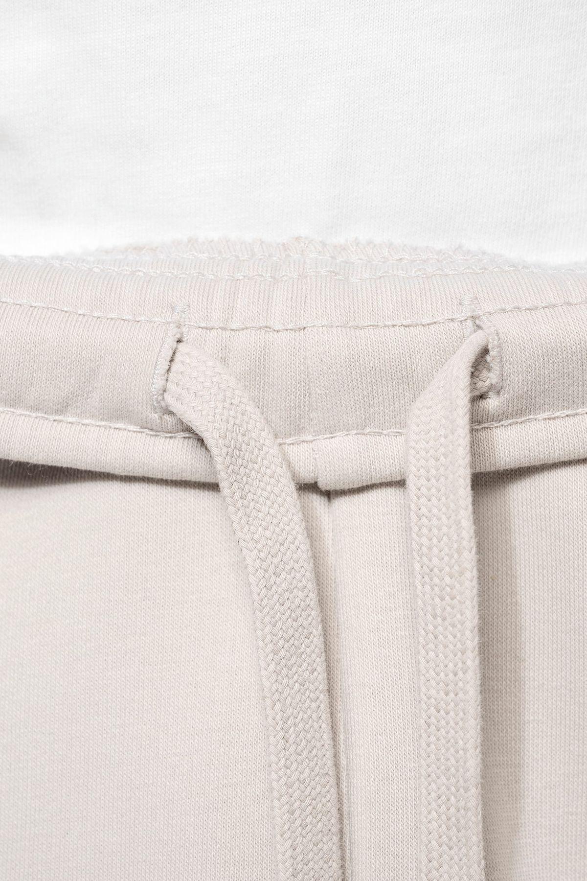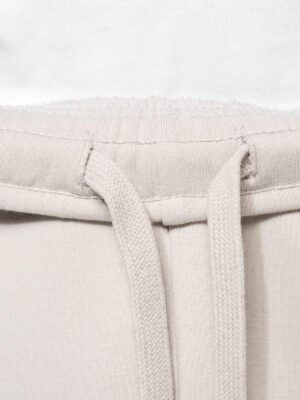 85% coton biologique / 15% polyester recyclé post-consumer. Coton peigné. Molleton gratté 3 fils LSF (Low Shrinkage Fleece). Lavage aux enzymes. Coupe droite. 2 poches côtés. Taille élastiquée avec cordon de serrage plat. Bas de jambes élastiqué. Pas d’étiquette de marque, uniquement une puce de taille pour faciliter la personnalisation.