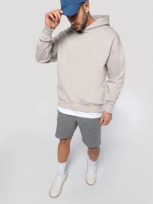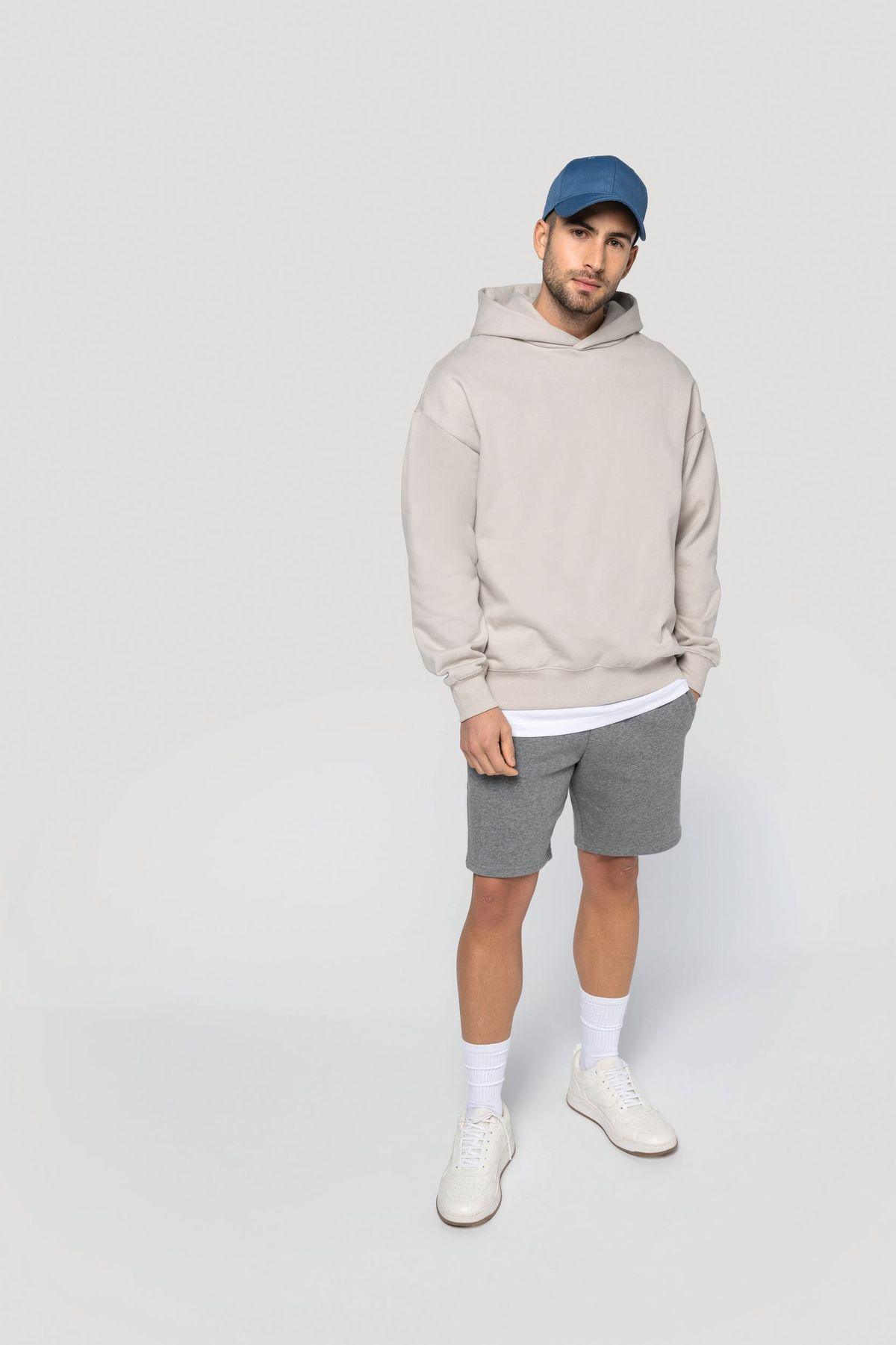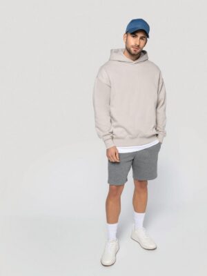 85% coton biologique / 15% polyester recyclé post-consumer. Molleton gratté 3 fils LSF (Low Shrinkage Fleece). Lavage aux enzymes. Coupe droite. 2 poches italiennes côtés. Taille élastiquée avec cordon de serrage plat. Double aiguille au bas de vêtement. Pas d’étiquette de marque, uniquement une puce de taille pour faciliter la personnalisation.