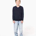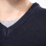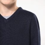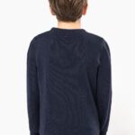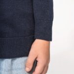 50% coton / 50% acrylique. Acrylique jauge 12. Bord-côte du col double épaisseur. Bande de propreté à l’encolure. Bord-côte au bas de manches et de vêtement.