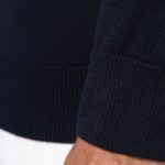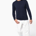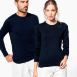 50% coton / 50% acrylique (jauge 12). Coupe ajustée. Bord-côte du col double épaisseur. Bande de propreté à l’encolure.
