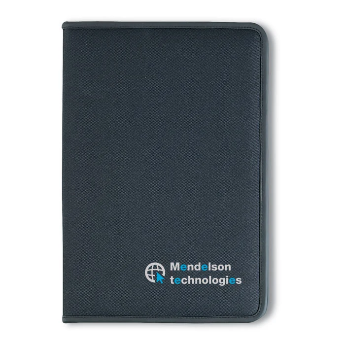 Conférencier A4. Polyester 600D et doublure 210T. Fermeture à glissière. Bloc-notes A4 20 feuilles lignées en papier recyclé. 4 compartiments. Porte-cartes.