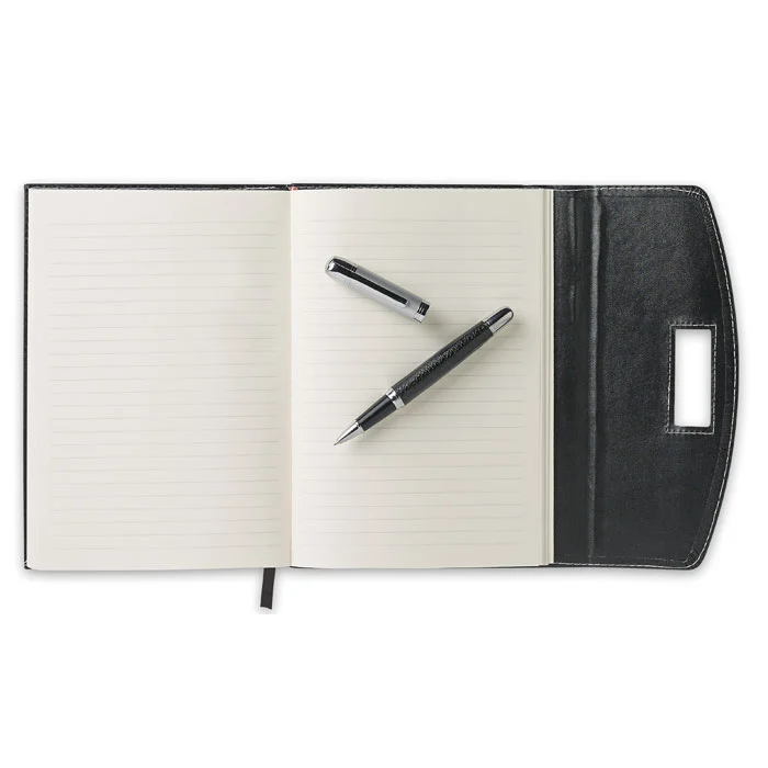 Porte-documents A5 en PU avec surpiqûres contrastées et stylo. 240 pages lignées (120 feuilles). Stylo en métal assorti. Encre noire.