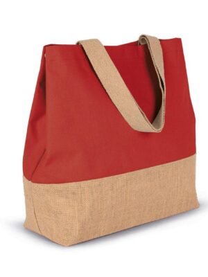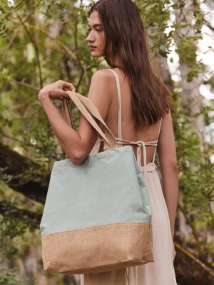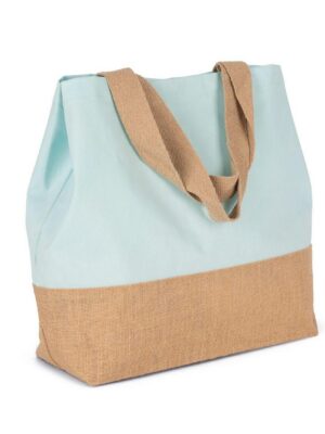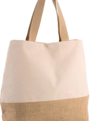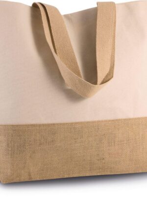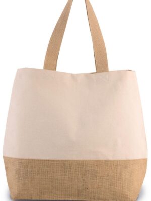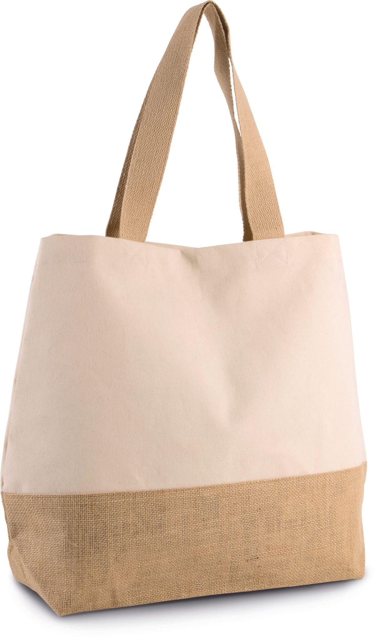 Grand sac fourre-tout en coton avec fond laminé en toile de jute naturel. Poche intérieure zippée. Soufflet. Poignées de 55 cm en coton. Fermeture à boutons pression.