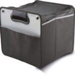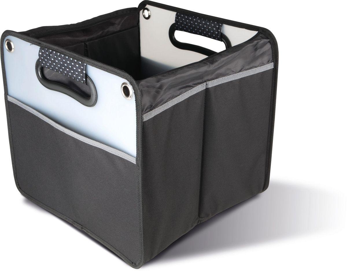 Sac rangement pour coffre avec rabat en polyester 600D, 1 grand compartiment pliant avec fermeture élastique et rabat zippé, poche côté, œillets métalliques sur côtés.