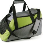 Sac de sport en polyester 600D et ripstop, 2 poignées, bandoulière ajustable, poche extérieure en filet sur le devant, grandes poches côté.