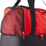 Sac pour sport collectif en polyester 600D avec base rigide. Diverses ouvertures zippées, lanière d’épaule renforcée et amovible, grandes poches côté dont une en filet.