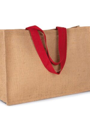 100% jute. Sac taille XL avec anses de couleur contrastée. L’étirage à l’amidon végétal permet de rigidifier la jute et donc le sac, qui garde ainsi sa forme.