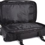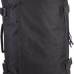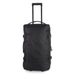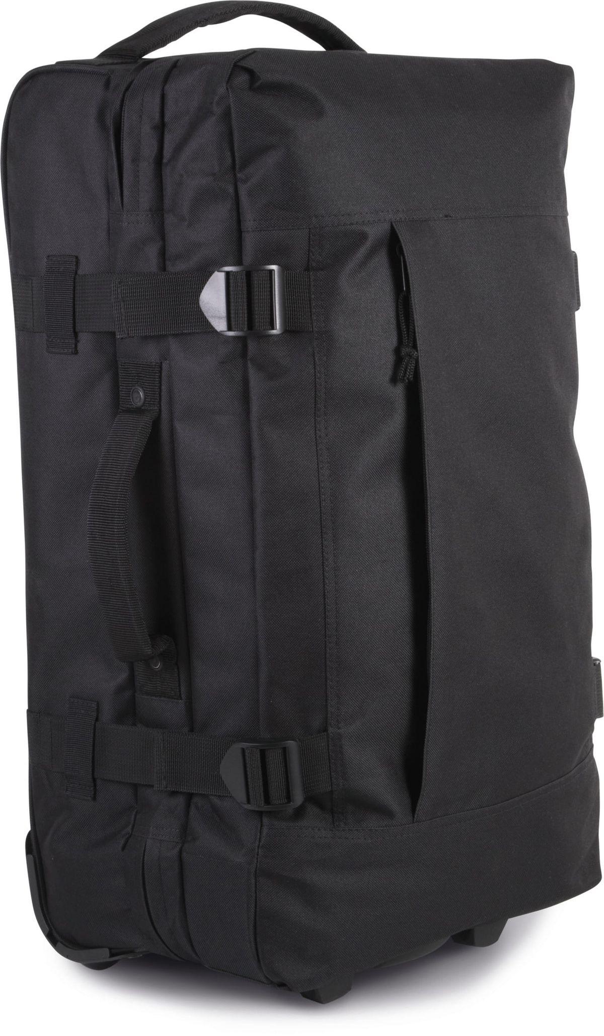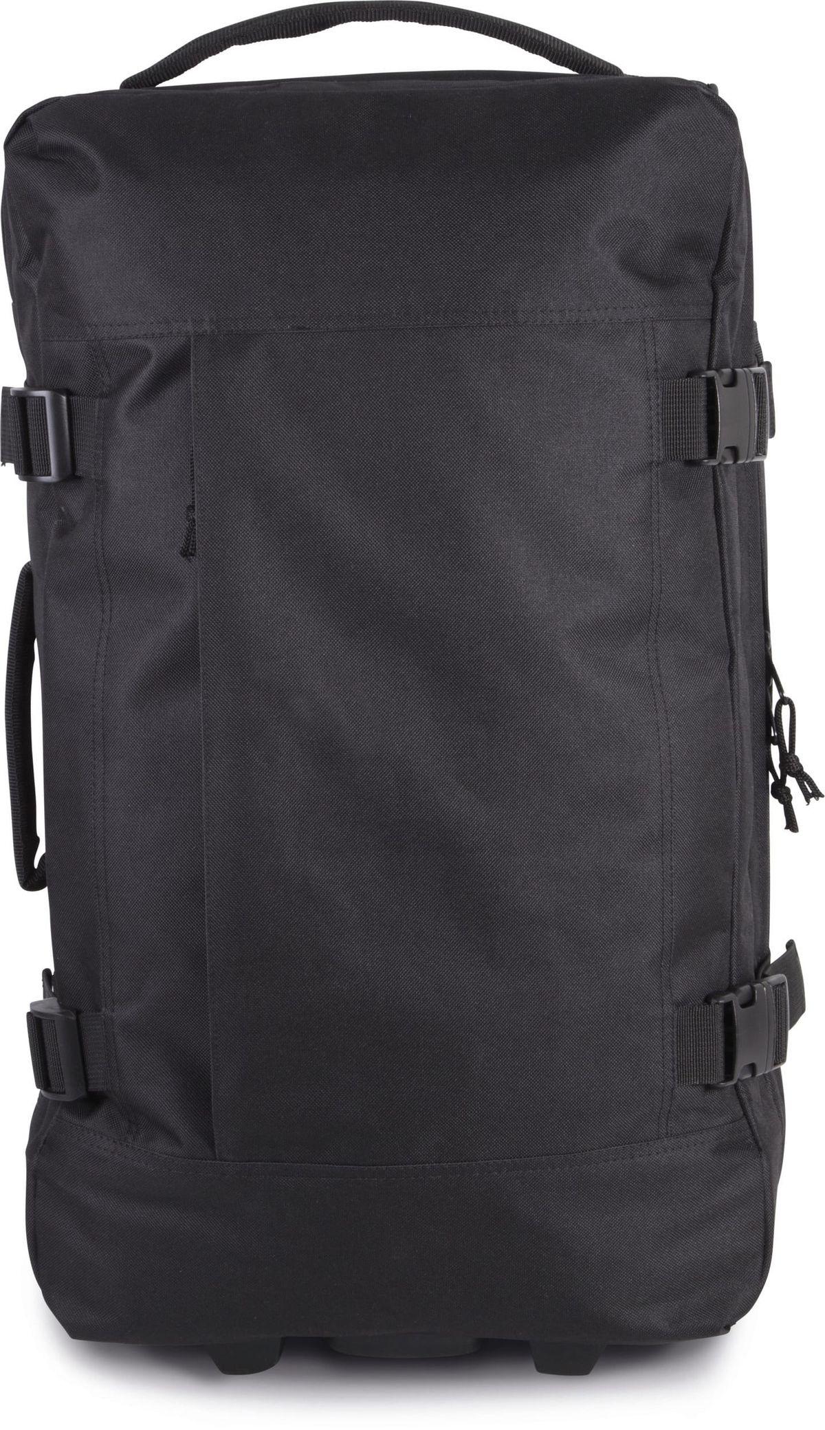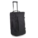 Sac trolley en polyester 600D avec grande poche zippée à l’avant pour faciliter la personnalisation. 2 compartiments internes avec sangles de maintien. Système de trolley rétractable. Sangles extérieures pour ajuster le volume. Base avec renforcement en relief et points d’arrêt sur les poignées.