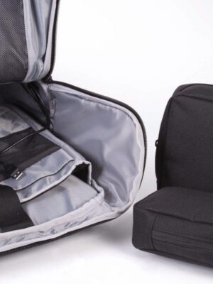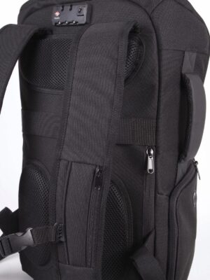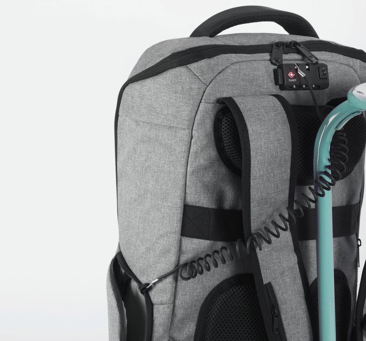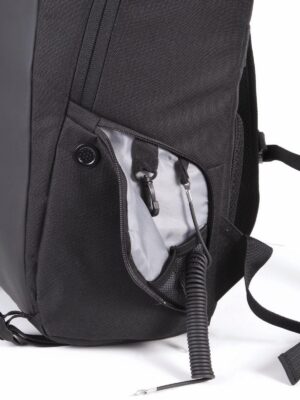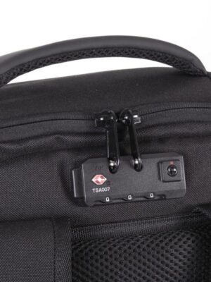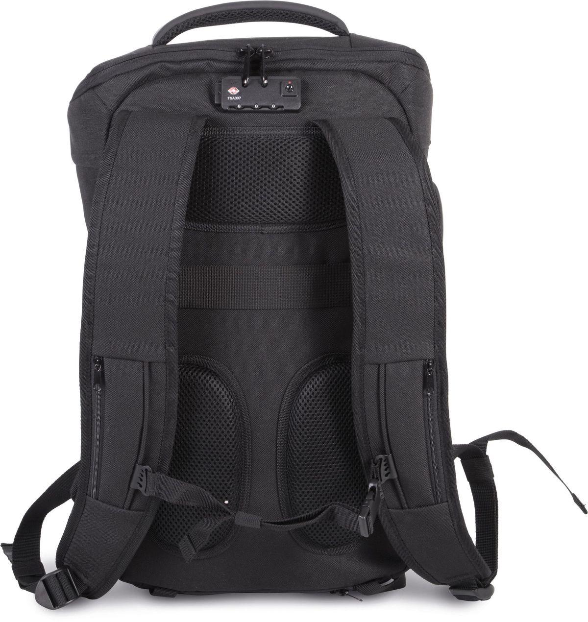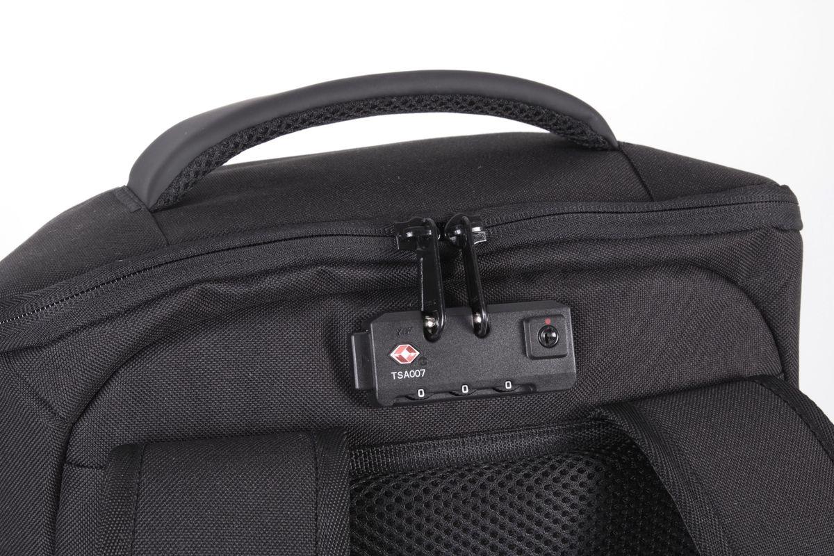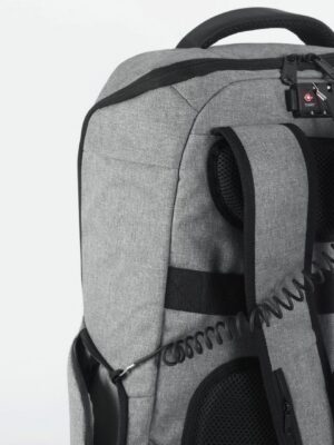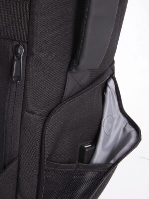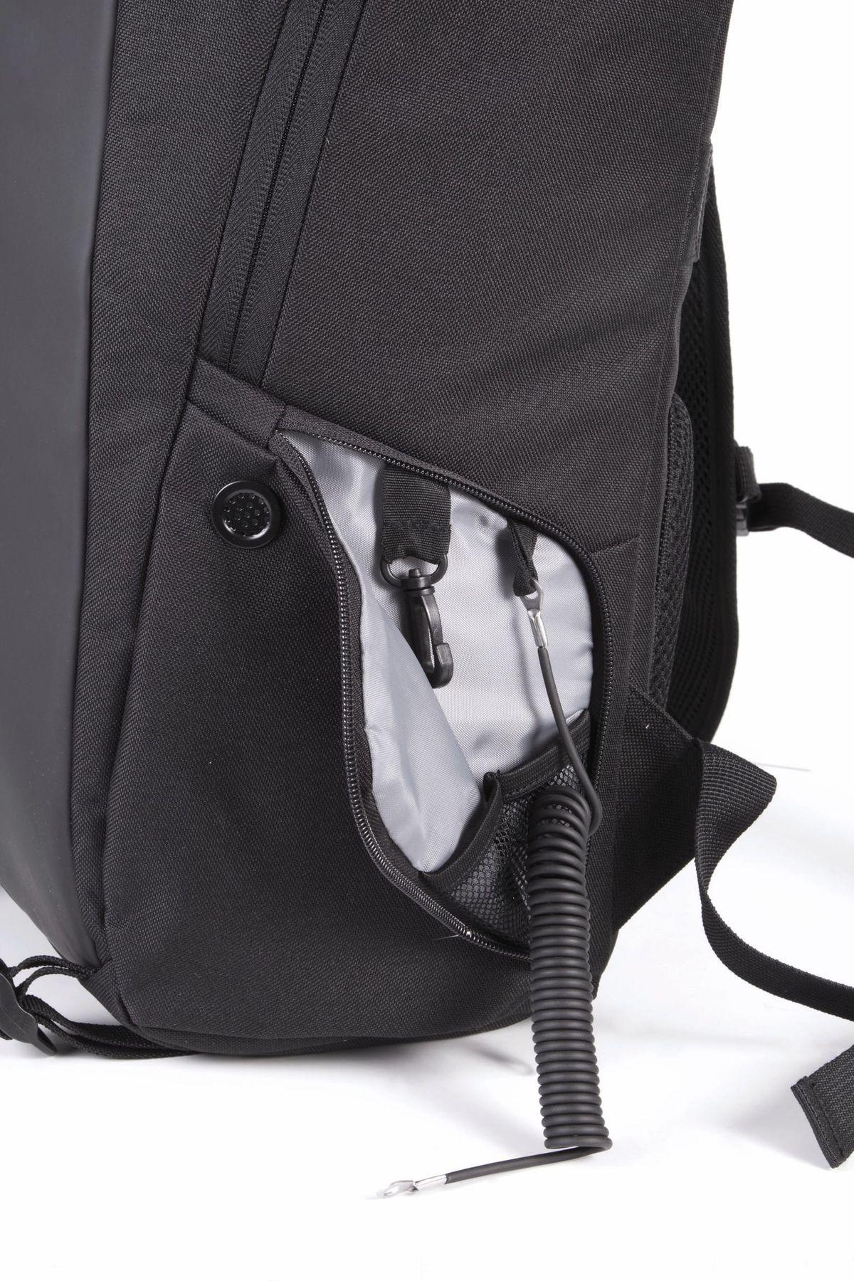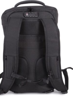 100% polyester. Dont 50% de polyester recyclé. Sac à dos antivol en polyester 600D. Panneau avant avec protection anti-coupure. Fermeture zippée au dos avec système de verrouillage TSA. Poche zippée à accès rapide au dos. Bretelles et sangle de poitrine ajustables. 2 poches zippées sur les bretelles. 2 sangles d’attache sous le sac pour transporter vestes, etc. 2 poches côté. 1 poche de chargement sur le côté, avec 1 port USB côté poche pour connexion de l’appareil à charger, et 1 port micro USB (câble inclus) côté sac pour branchement du Powerbank. 1 poche côté avec câble anti-vol spiralé pour attacher le sac à un pied de table ou de chaise. Compartiment intérieur avec rangement pour ordinateurs jusqu’à 15”. Rangement matelassé pour des tablettes jusqu’à 11”. 2 poches en maille filet. 2 pochettes zippées amovibles pour câbles et accessoires. 2 poches intérieures, dont 1 pour bouteilles/gourdes et 1 pour powerbanks. Housse anti-pluie avec réflecteurs de sécurité intégrée.