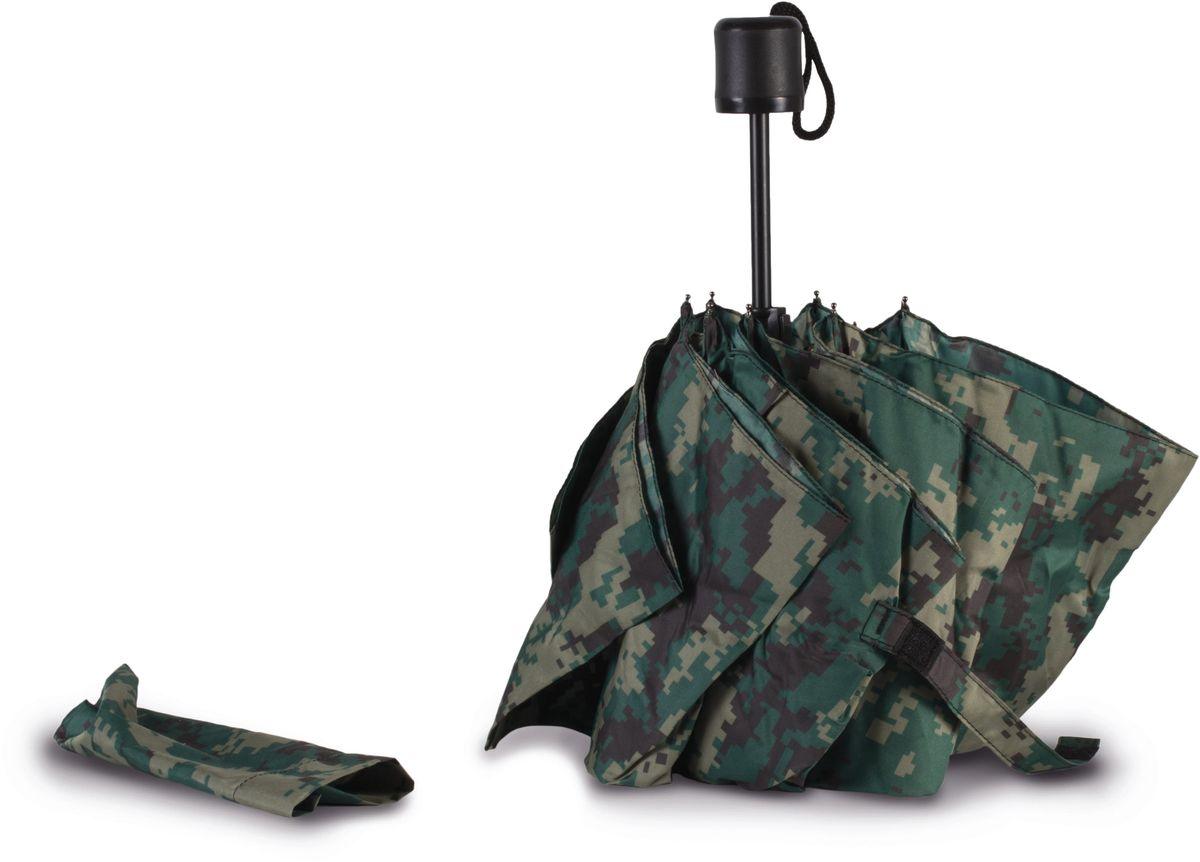Mini parapluie 21″ (diamètre : 98 cm) pliable en 3 parties, ouverture manuelle, mât en métal, baleines en fibres de verre, poignée en polypoprylène, toile 100% pongé de polyester, embouts de baleines en métal.