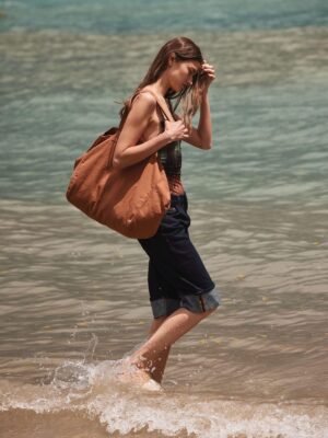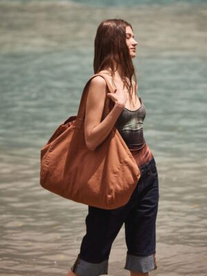 100% coton. Les produits délavés sont uniques et peuvent présenter de légères variations de couleur. Poche intérieure pour clés et téléphone. Grand soufflet pouvant être fermé par bouton-pression.
