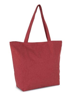 Coton recyclé / polyester recyclé. Grand sac shopping à fond plat et anses du même tissu que le sac. Ce sac fait partie du projet “K-loop”. À travers ce projet, Kimood ferme la boucle de l’économie circulaire au sens strict. Le coton utilisé provient en effet des déchets de fabrication des articles en coton de la marque Kariban, de la gamme KARIBAN BRANDS. Le polyester ajouté est issu du recyclage de bouteilles plastique en PET. Durant le processus de recyclage, des traceurs sont ajoutés au fil, à savoir des filaments en viscose et céramique qui font office d’empreinte digitale unique. Les traceurs réfléchissent la lumière de façon unique, et portent donc un code univoque et inviolable. Grâce à cela, nous pouvons donc mémoriser dans une chaîne de blockchain, toutes les informations des processus auxquels le fil a été soumis de façon univoque. Grâce à la technologie des traceurs Aware™ et à la plate-forme correspondante de blockchain, Kimood permet au consommateur final de suivre l’ensemble du processus de production. Cela permet de garantir que le produit a bien été recyclé en utilisant ses propres déchets, sans altérations possibles du processus. Une étiquette spéciale avec un QR code permet d’accéder à la plate-forme Aware™ et d’authentifier directement les certifications via un simple smartphone.