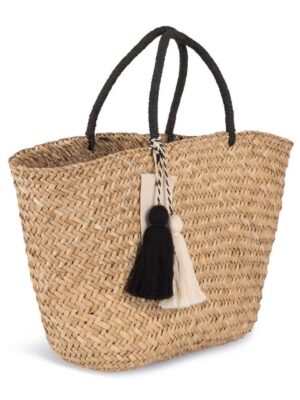 100% paille. Panier shopping classique avec tressage en fibres de paille. Pompon bicolore faisant office d’élément décoratif en coton et grande étiquette pour personnaliser facilement le produit.
