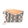 67% coton recyclé / 30% polyester recyclé / 3% autres fibres. L’intérieur de la pochette est doublé avec un tissu de couleur contrastée. La pochette est dotée d’une dragonne en corde de coton. Le tissage jacquard confère un aspect unique à chaque pièce.