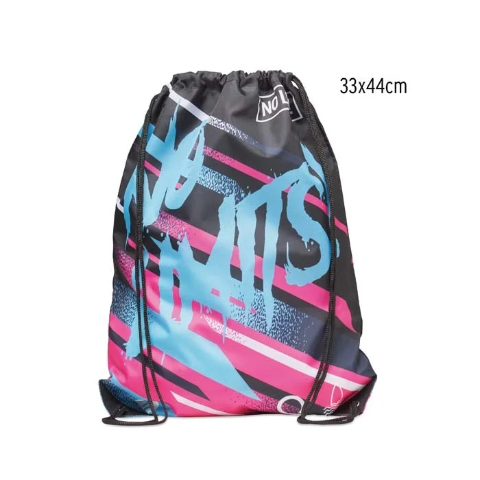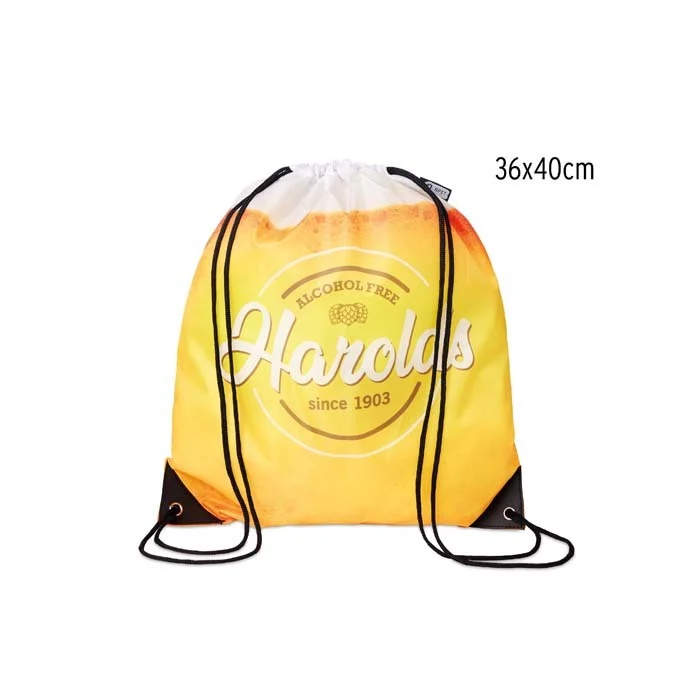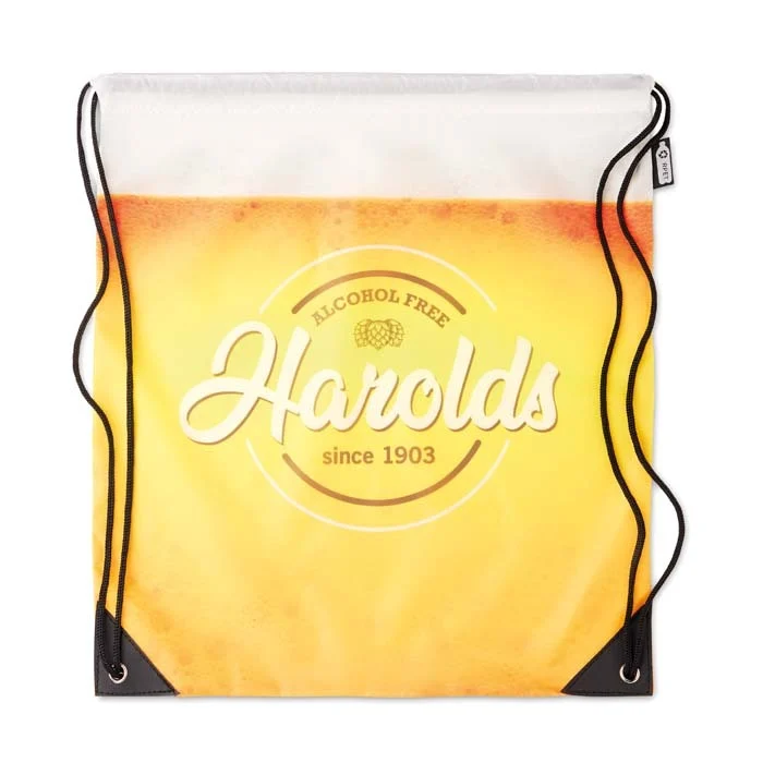Sac à cordon en polyester recyclé (RPET) avec coins en PU. La fermeture à cordon permet d’accéder facilement au contenu intérieur tout en le maintenant bien en place lors de l’utilisation.