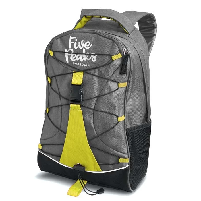 Sac à dos d’aventure en polyester 600D avec revêtement contrasté coloré et cordon de décoration sur le panneau avant. Poches en filet sur les deux côtés.