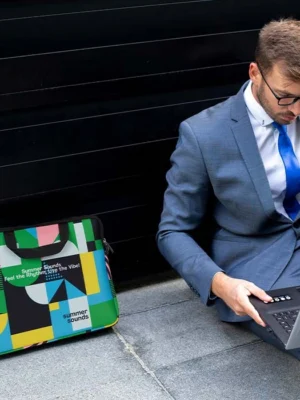 Pochette sublimée en couleur pour ordinateur portable, fabriquée en néoprène absorbant les chocs. La bande trolley en fait le choix idéal pour les voyageurs d’affaires.