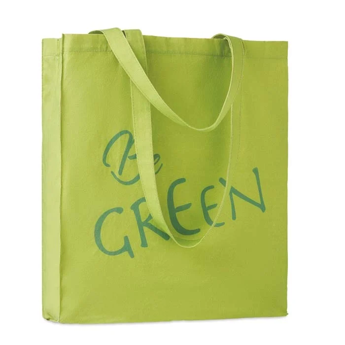 Sac shopping en coton avec soufflet et longues anses. Choisissez parmi les différents grammages disponibles, faites produire les sacs en coton dans leur couleur naturelle ou teintés dans la couleur de votre logo et commencez à concevoir.