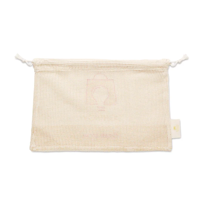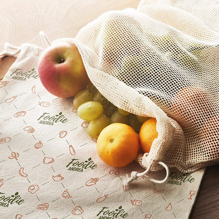 Sac en filet sur mesure pour les produits frais, entièrement fabriqué en 100% coton. Une face est en coton (140gr/m²) qui peut être imprimée sur toute sa surface avec le motif de votre choix. La maille de coton de l’autre côté permet la circulation de l’air pour garantir la fraîcheur de vos produits d’épicerie.
