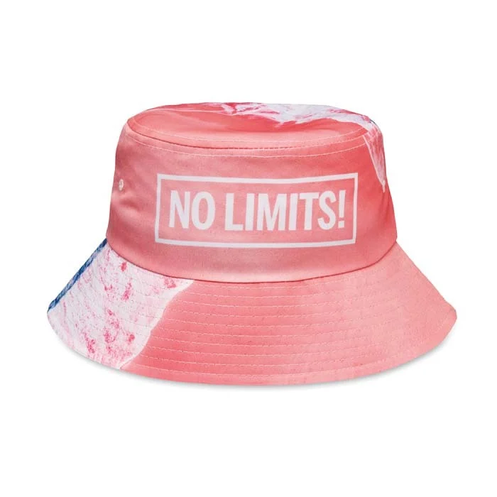 Bob en polyester blanc 200gsm avec votre design imprimé sur toute la surface extérieure. La bordure intérieure et le bandeau de transpiration sont en polyester noir.