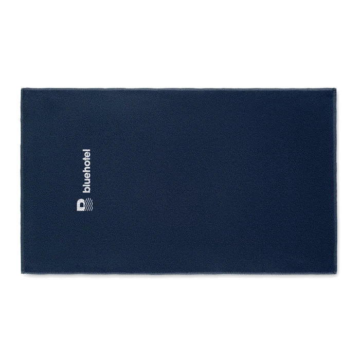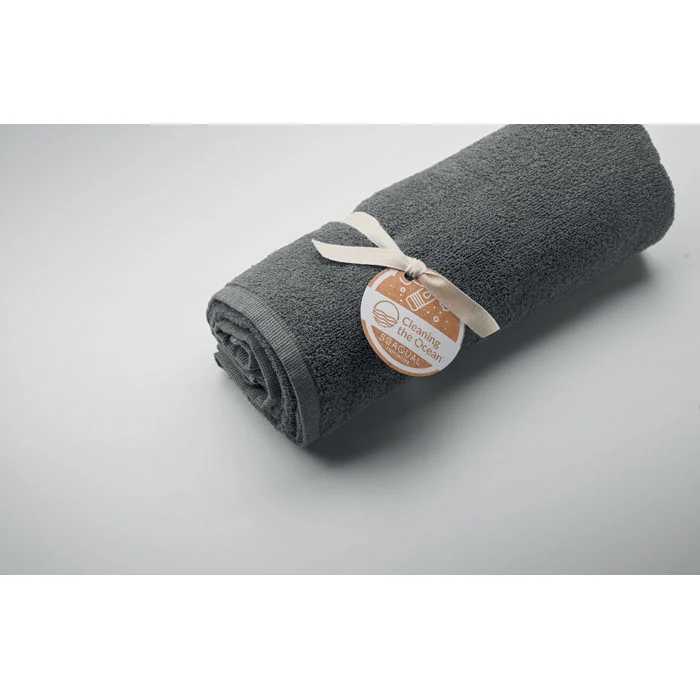 Serviette de bain ou de plage jacquard en tissu recyclé. 70% coton recyclé et 30% polyester recyclé polyester recyclé SEAQUAL® YARN. 500 gr/m². 100×170 cm. SEAQUAL INITIATIVE collabore avec des organismes de nettoyage des océans dans le monde entier afin de valoriser les déchets qu’ils récupèrent. les déchets qu’ils récupèrent. Fabriqué dans l’UE.