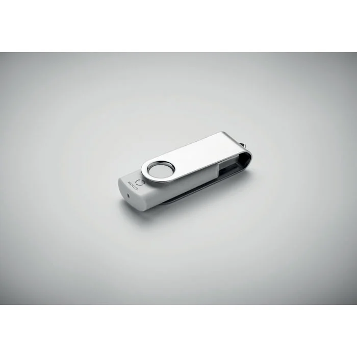 Clé USB 2.0 de 16 Go avec corps en ABS recyclé en finition blanche. Tournez le couvercle en métal rotatif et connectez-le au port USB pour commencer à l’utiliser.