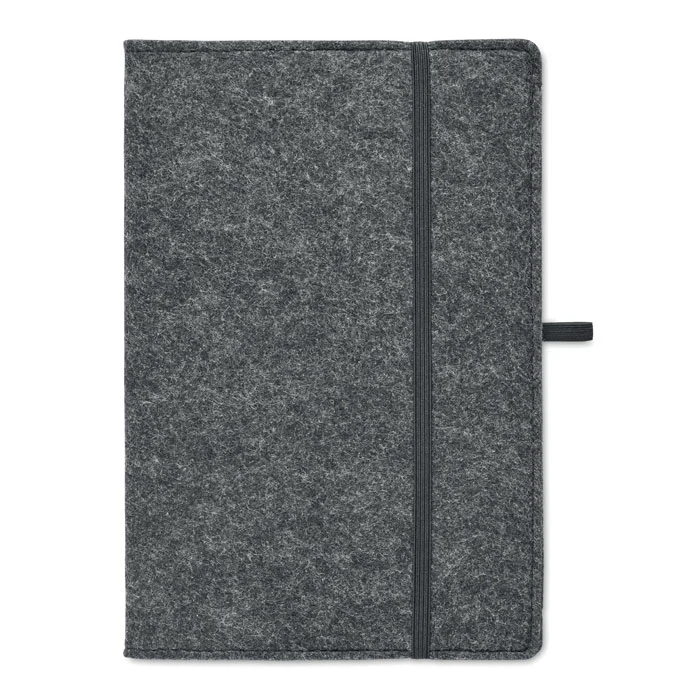 Carnet A5 avec couverture en feutre RPET. 160 pages lignées en papier recyclé (80 feuilles / 70 gr/m²). Passant pour stylo.