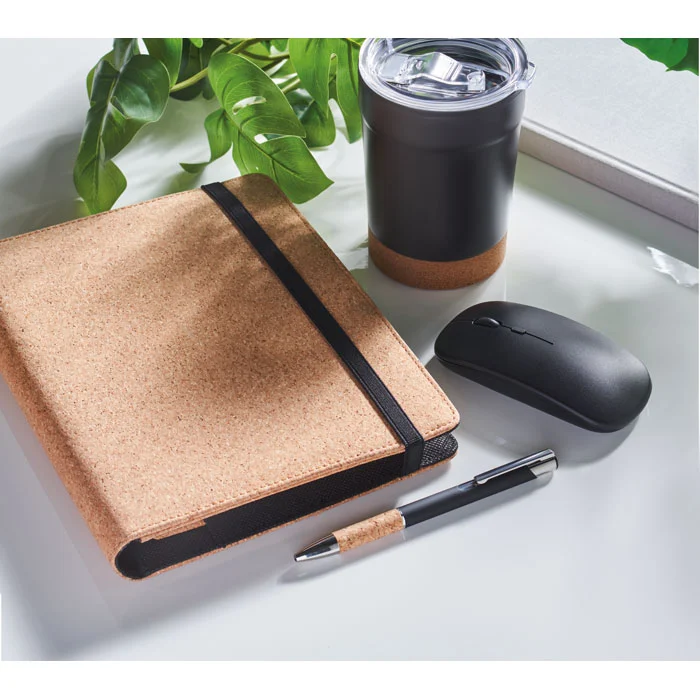 Conférencier A5 en liège. Carnet de notes A5 amovible avec couverture en liège rigide. 192 pages lignées en papier recyclé (96 feuilles). Stylo et porte-stylo assortis. 2 porte-cartes et un grand compartiment. Fermeture élastique.