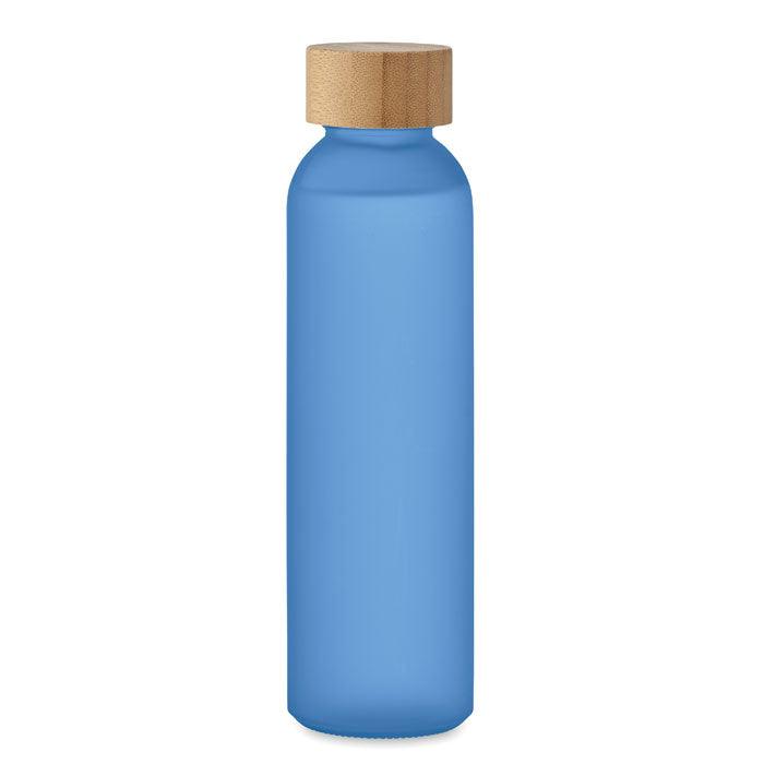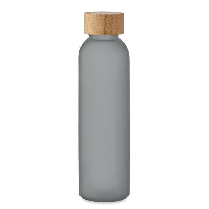 Bouteille en verre avec finition givrée et couvercle en bambou. Anti fuite. Capacité : 500 ml. Le bambou est un produit naturel, et présente de légères variations de couleur, de décoration et de tailles.