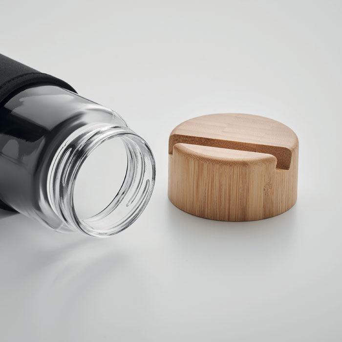 Bouteille en verre avec pochette en neoprène, couvercle en bambou et support pour smartphone. Sans fuite. Capacité : 600 ml. Le bambou est un produit naturel, et présente de légères variations de couleur, de décoration et de tailles.