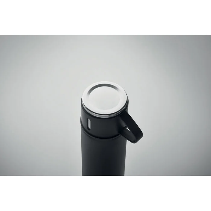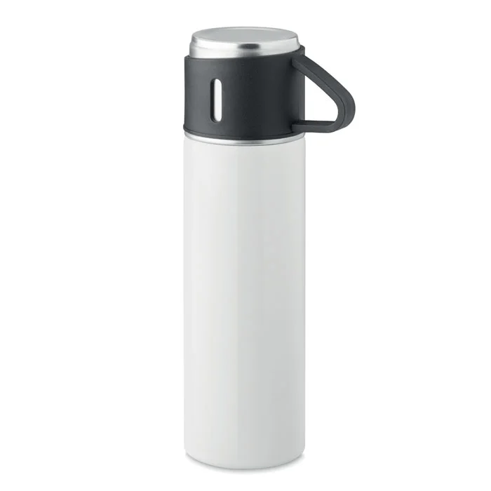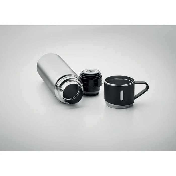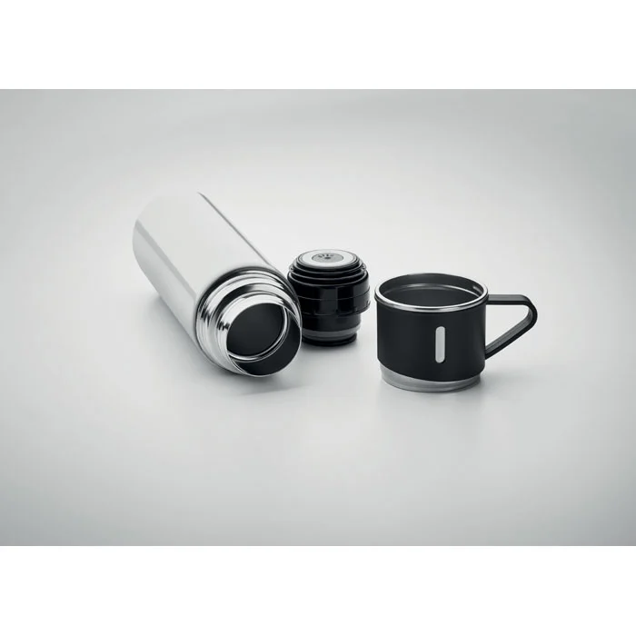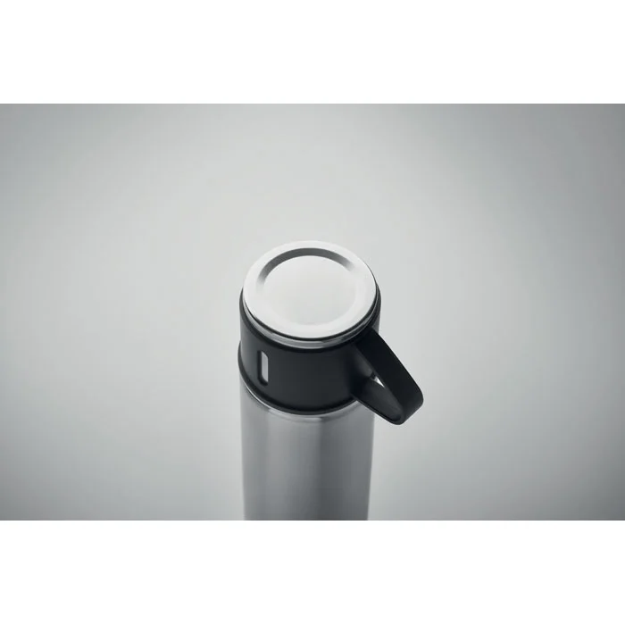 Gourde en acier inoxydable à double paroi, à vide isolant, avec bouchon gobelet étanche. Capacité : gourde 420 ml, gobelet 150 ml.