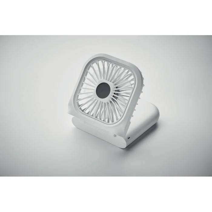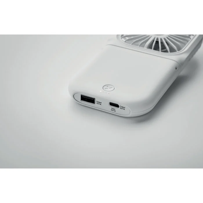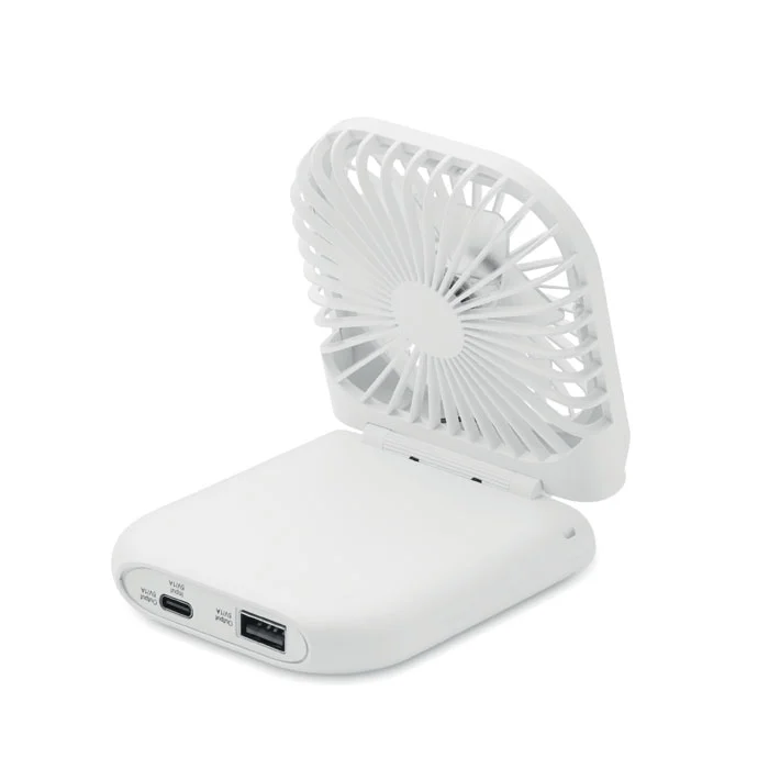 Ventilateur portable pliable avec lanyard réglable. 3 vitesses. Peut également être utilisé comme ventilateur de bureau lorsqu’il est plié. Powerbank rechargeable 3000 mAh. Entrée type C. Sortie type A et C.