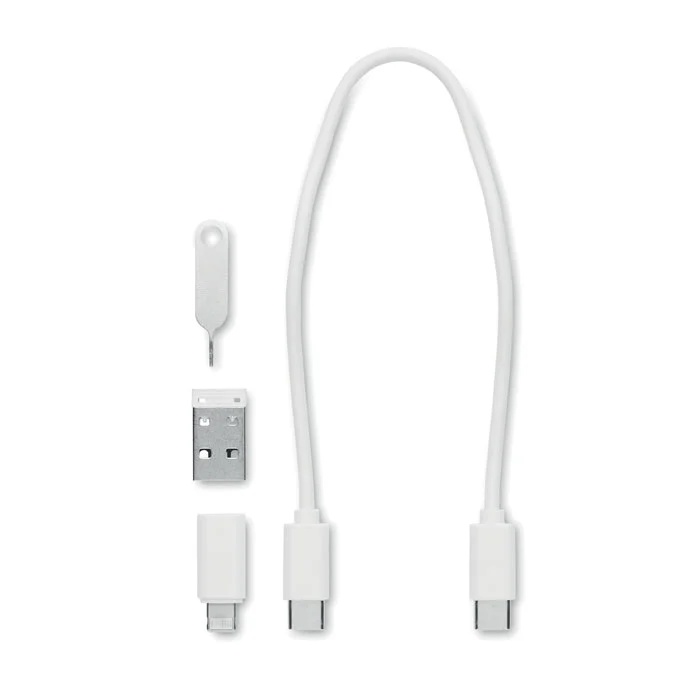 Ensemble de câbles et de connecteurs 9 en 1. Câble de transfert de données et de charge (480 Mbps) : Type-C à Type-C. Adaptateurs : Type-C vers Type-A et Type-C vers 2-en-1 & micro-B. Fentes de stockage Micro et Nano SIM. Outil d’éjection.