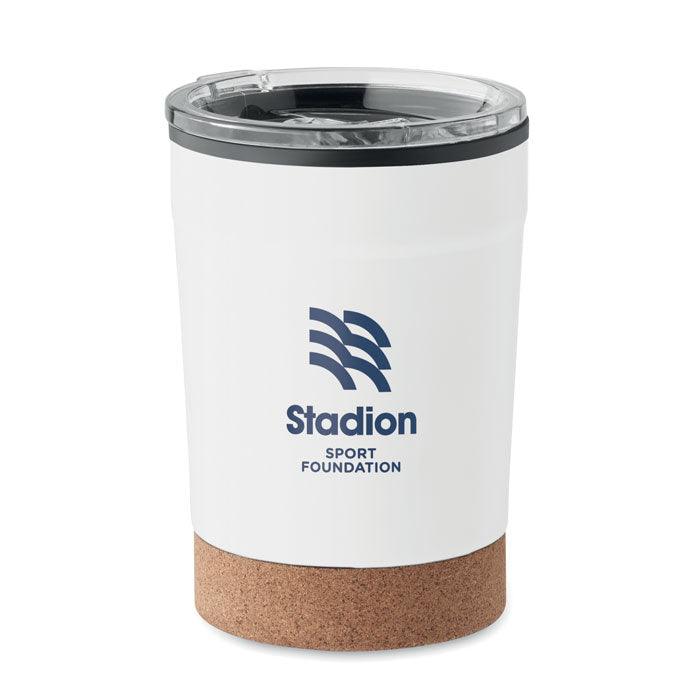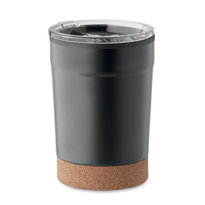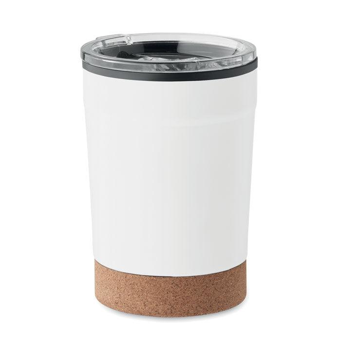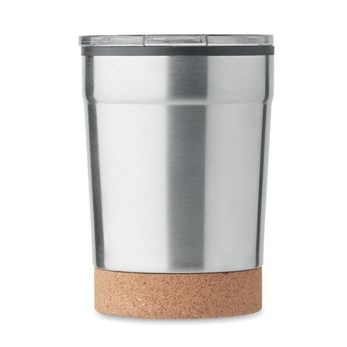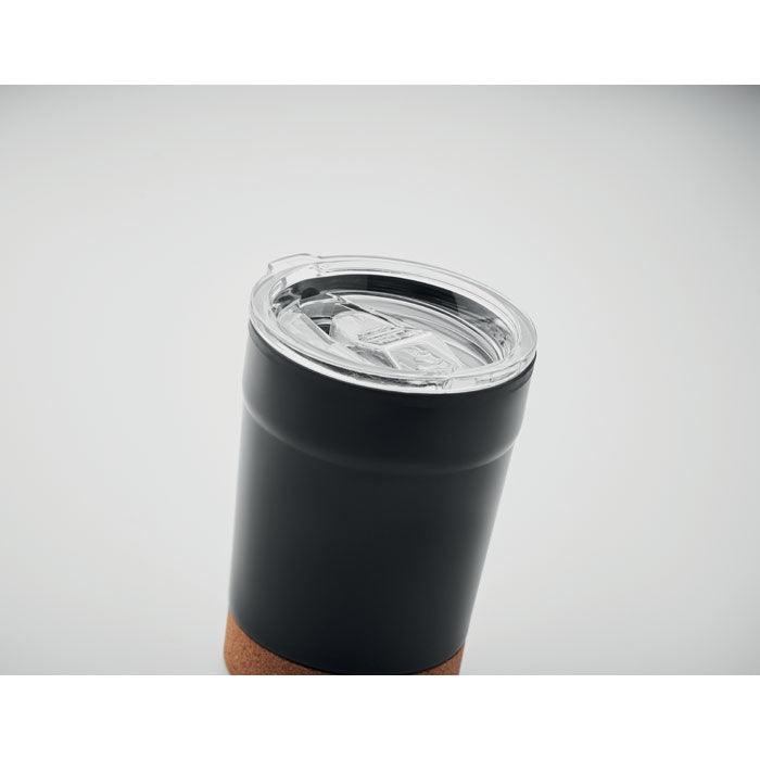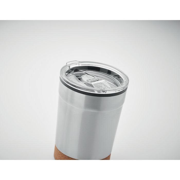 Gobelet à double paroi en acier inoxydable à l'extérieur et en PP à l'intérieur, avec base en liège et interstice coulissant pour boire. Sans fuite. Capacité : 300 ml.