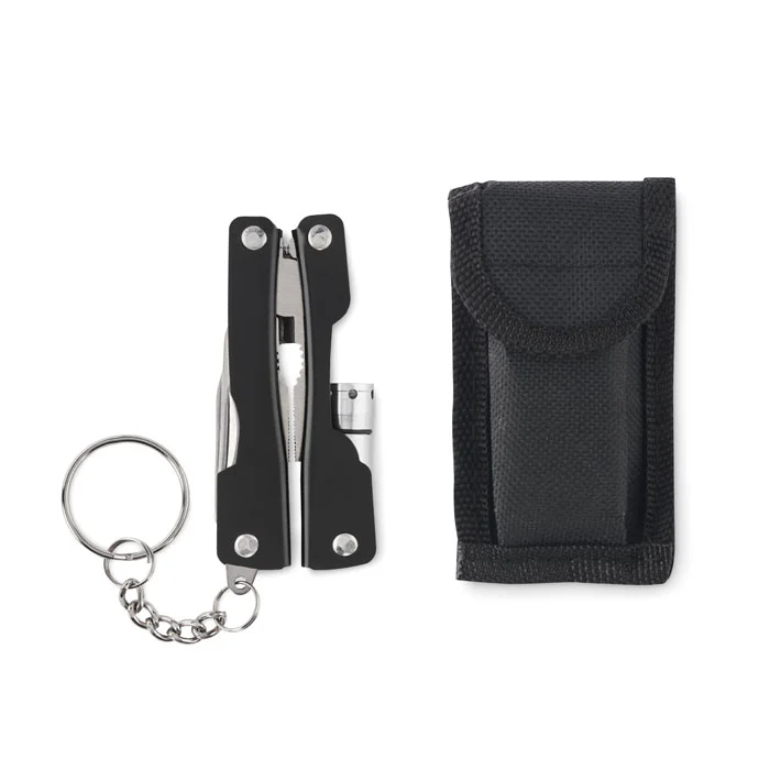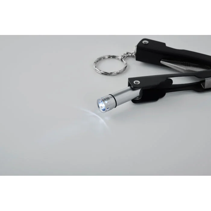 Couteau multi-outils pliable avec lampe de poche en acier inoxydable. Comprend 10 fonctions d’outils et une pochette en polyester 600D. 3 piles bouton AG3 incluses.