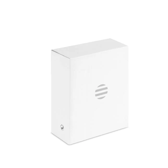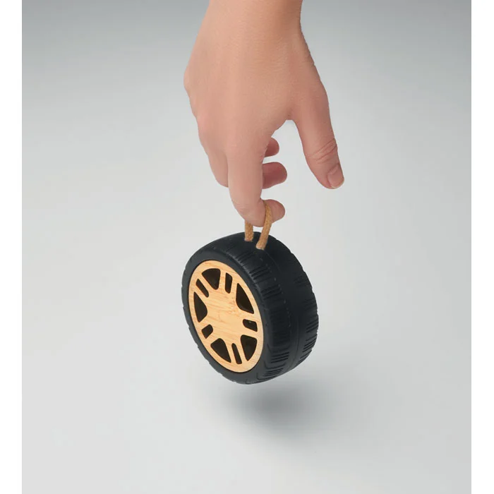 Haut-parleur sans fil 3W 5.3 en forme de roue en ABS recyclé avec détails en bambou et poignée en corde de coton. Batterie rechargeable de 400 mAh.