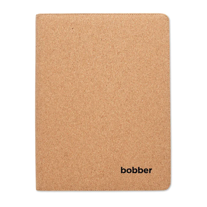 Conférencier A4 en liège. Bloc-notes A4 rechargeable. 30 feuilles lignées en papier recyclé. Stylo et porte-stylo assortis. 2 porte-cartes et un grand compartiment.