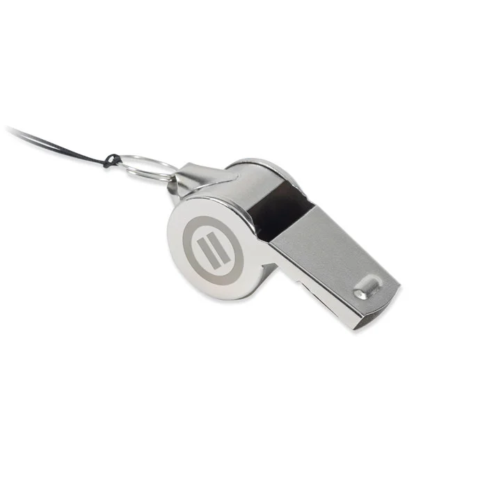 Sifflet en métal attaché à un cordon avec boucle de sécurité.