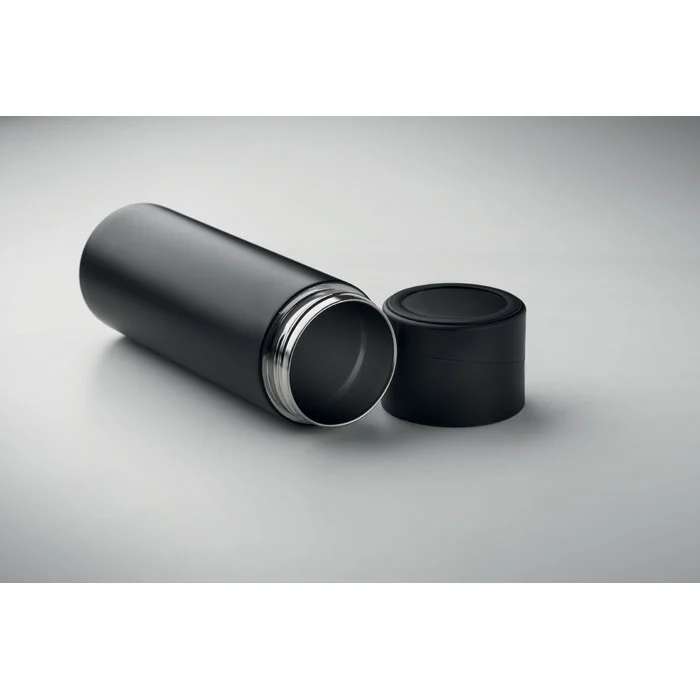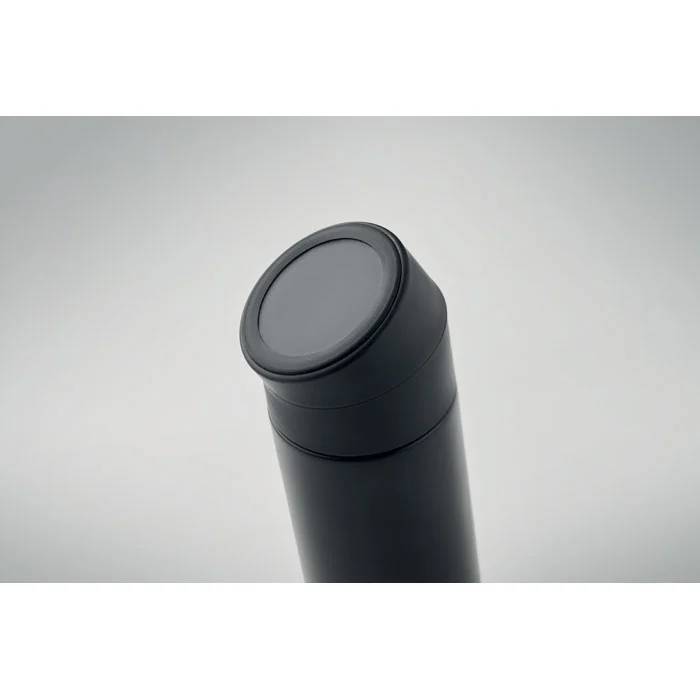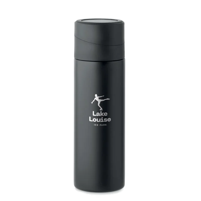 Bouteille isolante sous vide à double paroi en acier inoxydable recyclé (90 % d’acier inoxydable recyclé et 10 % d’acier inoxydable) avec couvercle en silicone antidérapant pour téléphone portable. Anti fuite. Capacité : 420 ml.