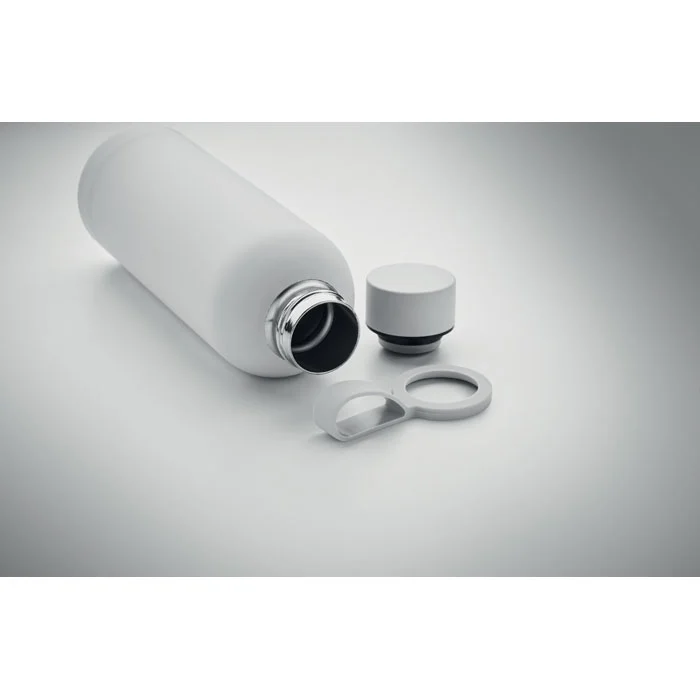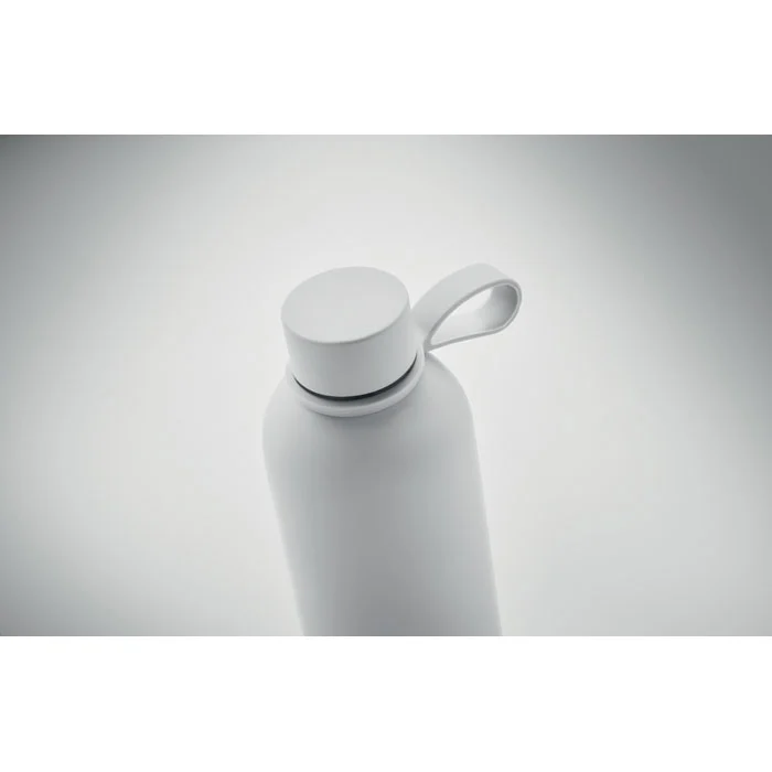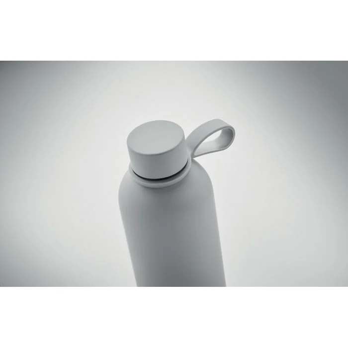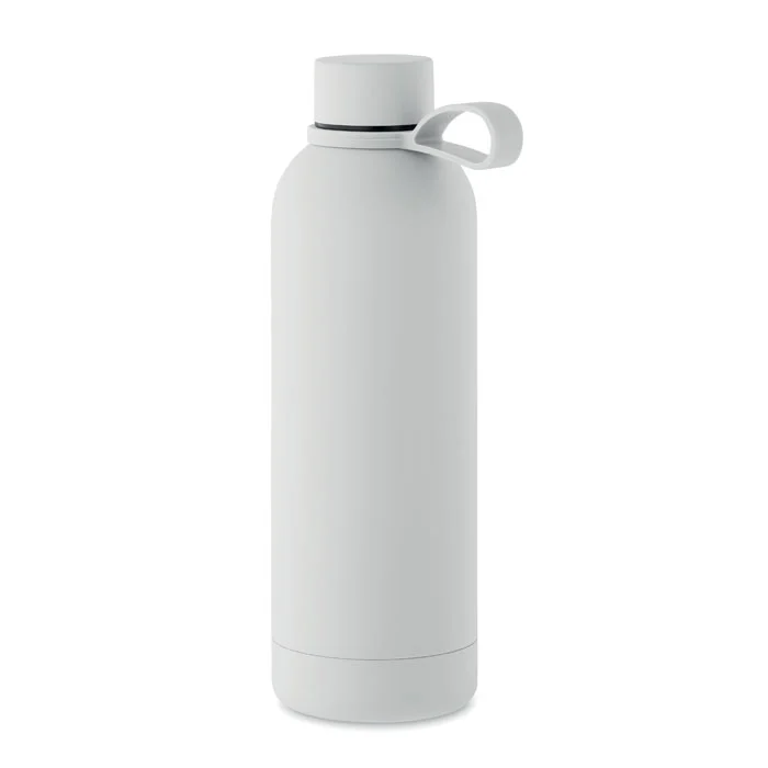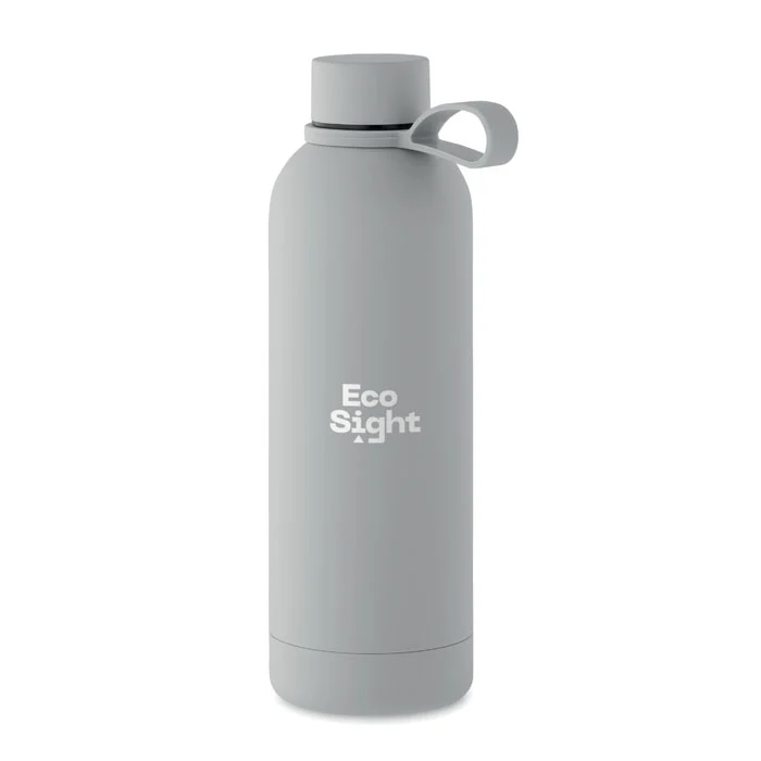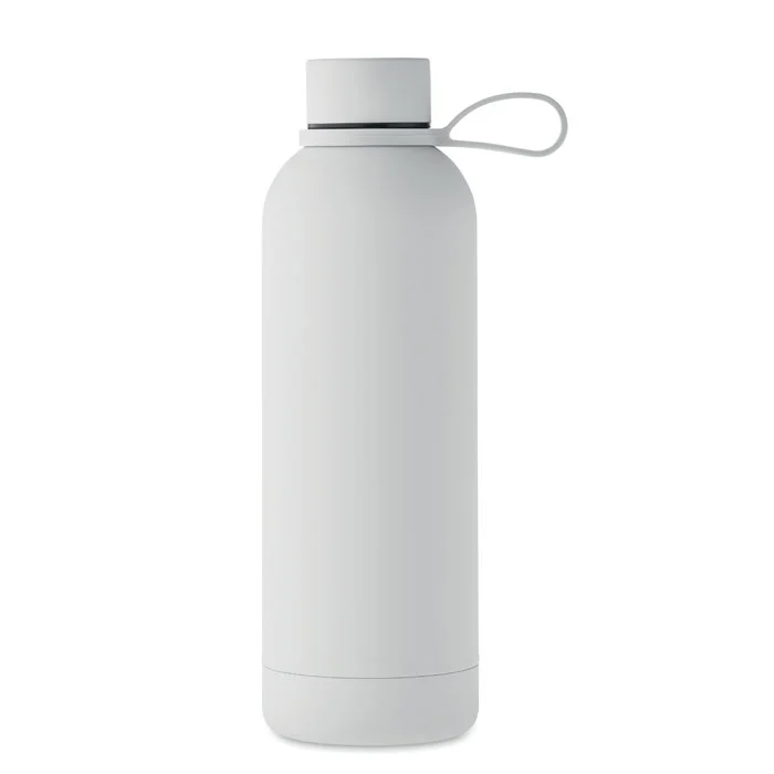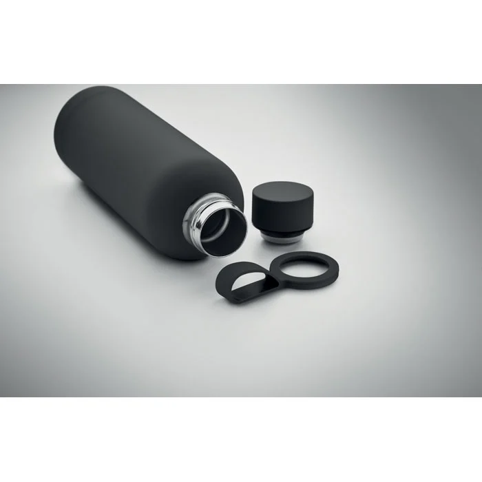 Bouteille isolante sous vide à double paroi en acier inoxydable recyclé (90 % d’acier inoxydable recyclé et 10 % d’acier inoxydable) avec finition en caoutchouc et poignée en silicone. Anti fuite. Capacité : 500 ml.