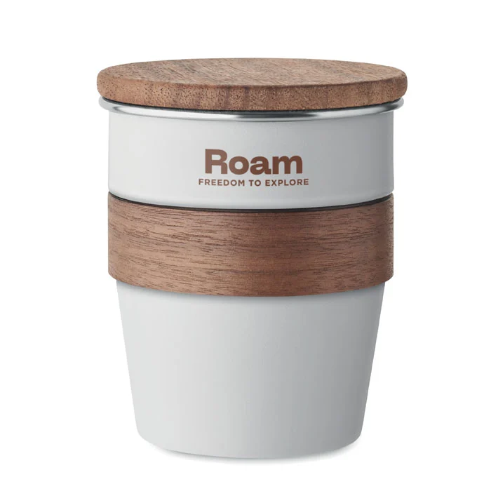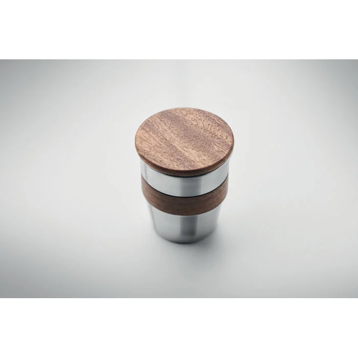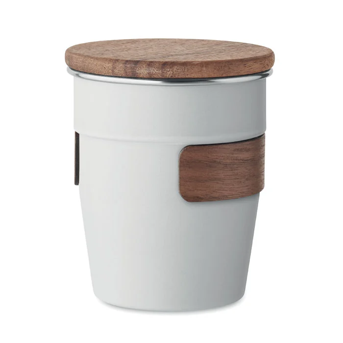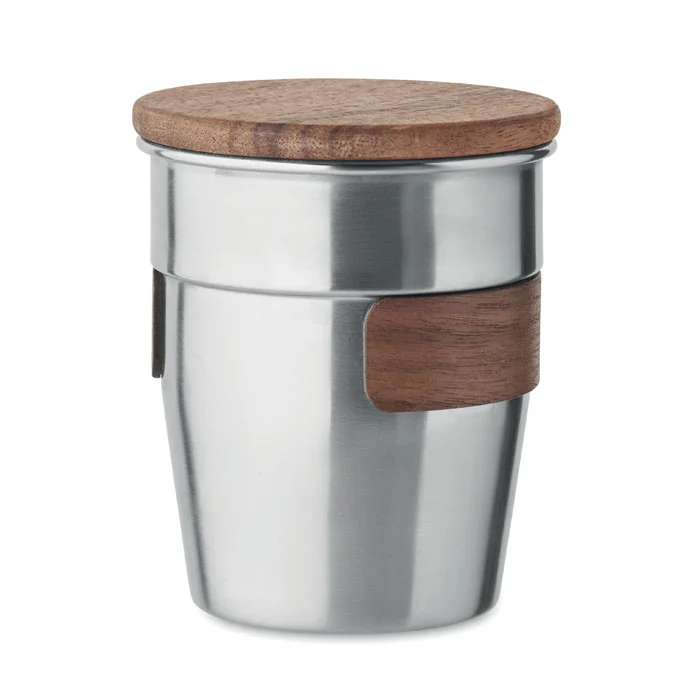 Gobelet à simple paroi en acier inoxydable recyclé (90 % d’acier inox recyclé et 10 % d’acier inox) avec poignée et couvercle en noyer. Capacité : 350 ml. Retirer la poignée pour le nettoyage. Comme il s’agit de simple paroi, il peut y avoir transfert de chaleur.